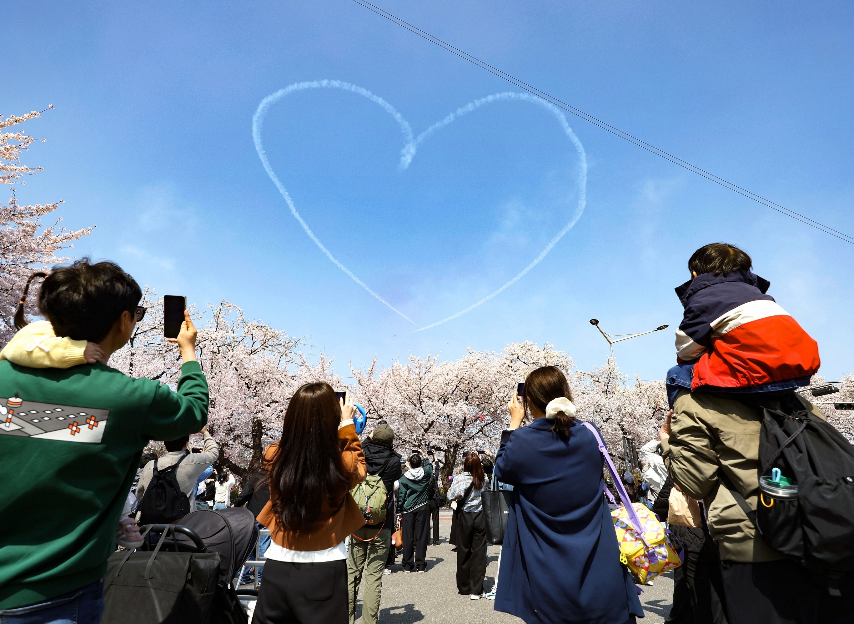 第22届汝矣岛春花节开幕,韩国空军飞行表演队用彩烟在空中绘出「爱心」图案,首尔。春花节是首尔最具代表性的春季庆典活动之一,本年度庆祝活动从4月3日持续至7日,主题为「春日花园,相聚」(Spring Garden, Together),汝矣岛将举行电影放映、艺术展、美食集市等活动,该地区超过1800棵樱花树已全部进入盛开状态,预计将吸引300万游客访问。摄影师:iDaily Media