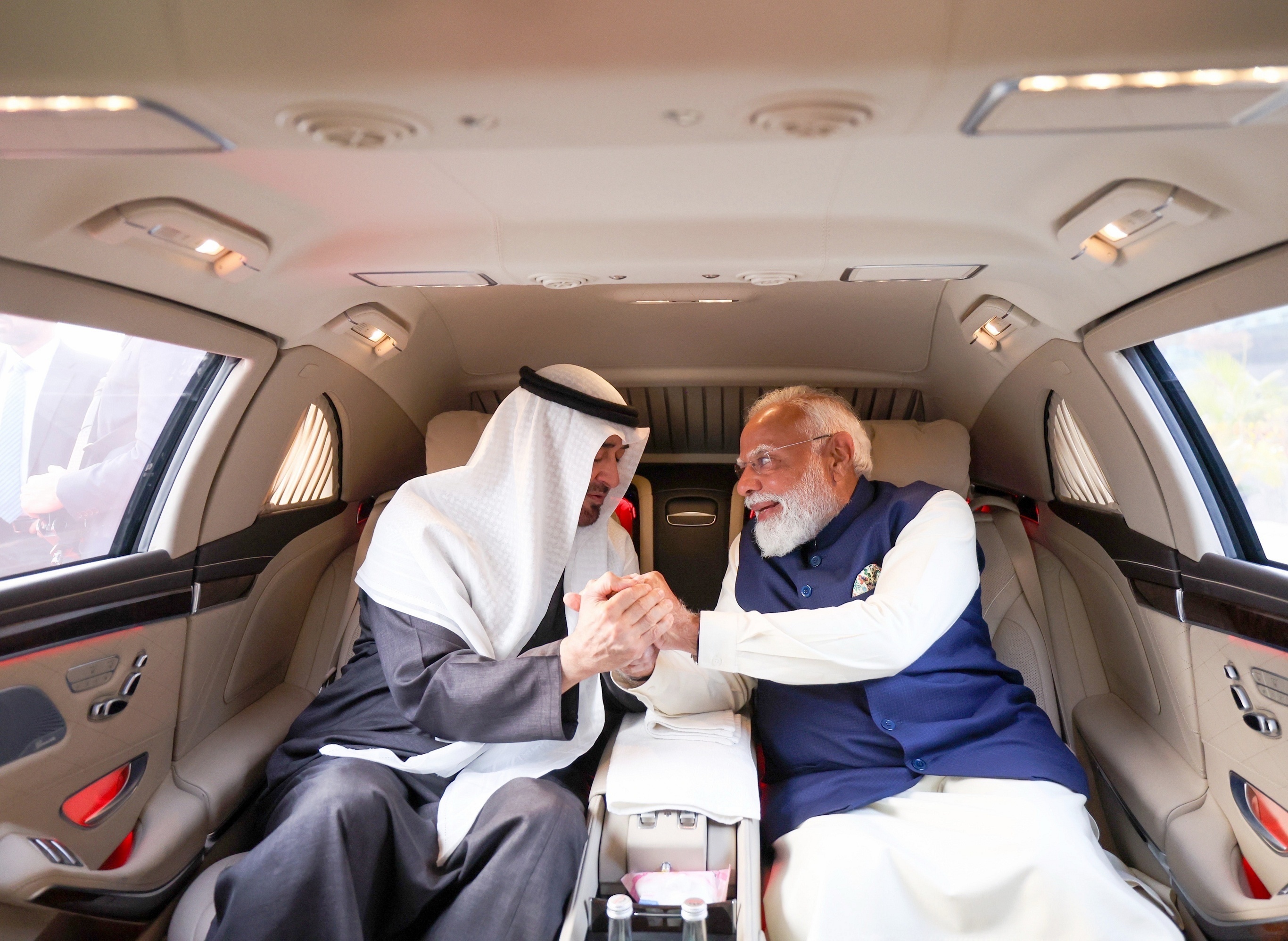 印度总理 Narendra Modi 乘专车迎接阿联酋总统 Sheikh Mohammed bin Zayed Al Nahyan,新德里。1月19日,阿联酋总统应邀对印度进行时长仅2小时的短暂访问,两国领导人就印阿关系、双边合作、国际及地区局势等议题交换意见。双方当天正式签署建立战略防务伙伴关系的意向书,以及一份价值30亿美元的液化天然气长期合约。根据该合约,阿联酋将从2028年起连续10年向印度每年供应50万吨液化天然气,印度届时将成为阿联酋最大的液化天然气购买国。摄影师:India PIB