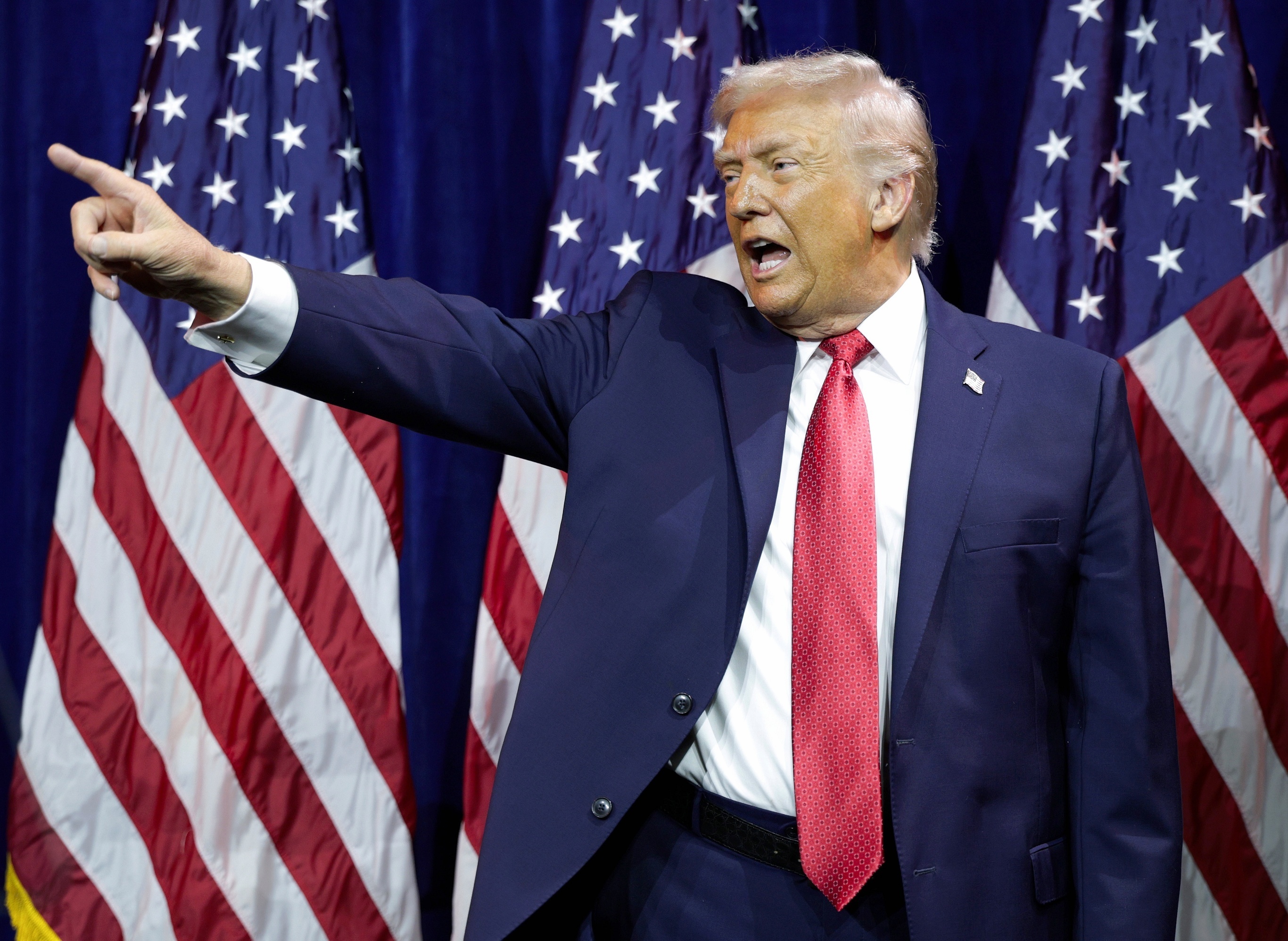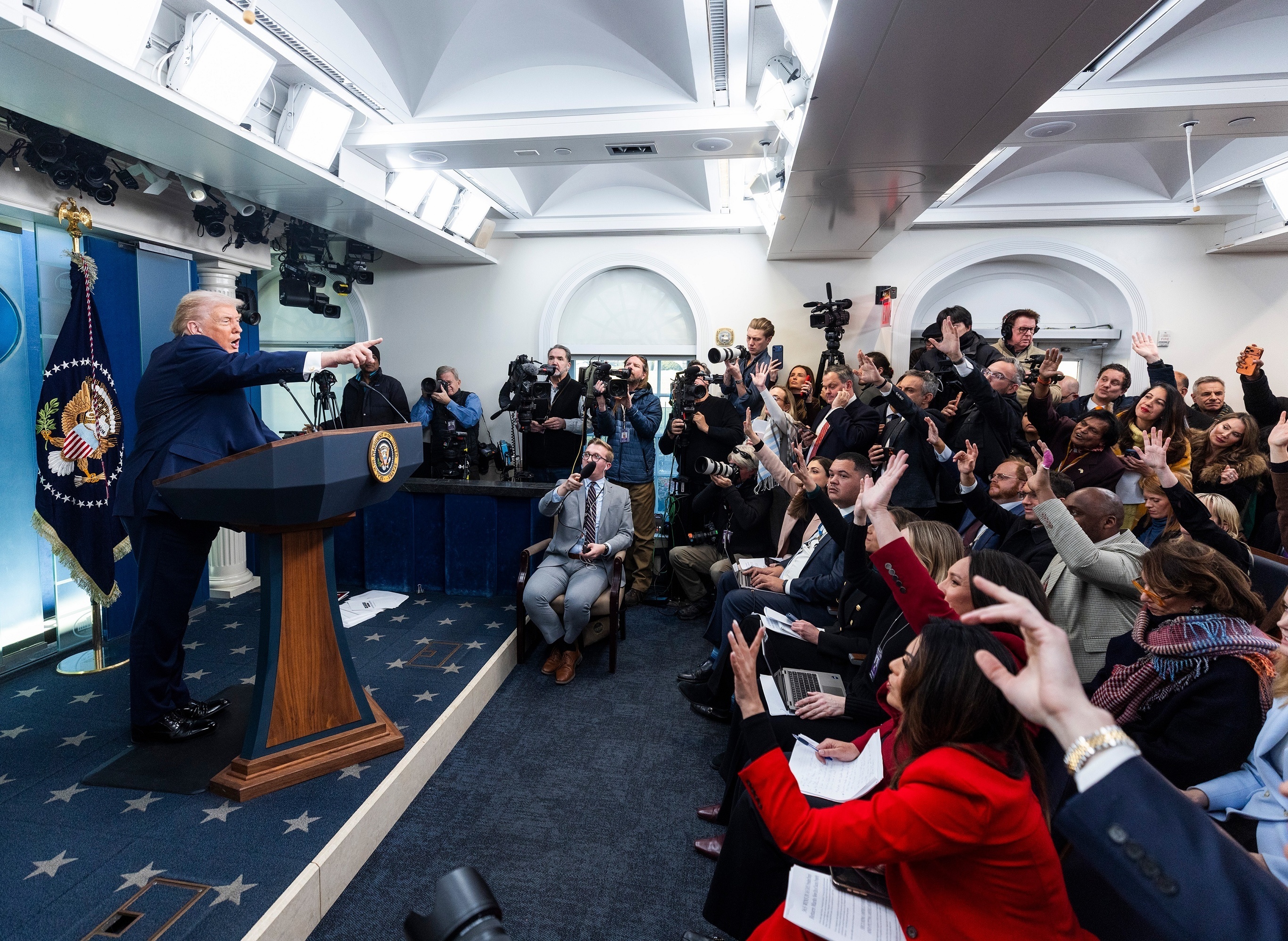 美国总统 Donald Trump 举行「重返白宫一周年」新闻发布会,华盛顿特区。1月20日,美国总统 Trump 在白宫简报室举行长达1个半小时的记者会回顾重新执政一年来取得的主要政绩,包括签署228项行政命令、实现50年来首次净移民负增长、吸引近10万亿美元新投资、创造65.4万个就业岗位、签署美国现代史上规模最大的中产阶级减税法案、节省2150亿美元政府开支、结束全球多场冲突、实现创纪录的能源产量等。Trump 宣称过去一年是美国现代史上总统任期中最辉煌的一年,强调始终以「美国优先」作为首要原则。最新民调显示 Trump 当前支持率为37%,处于本届任期迄今最低水平。摄影师:Jim Lo Scalzo
