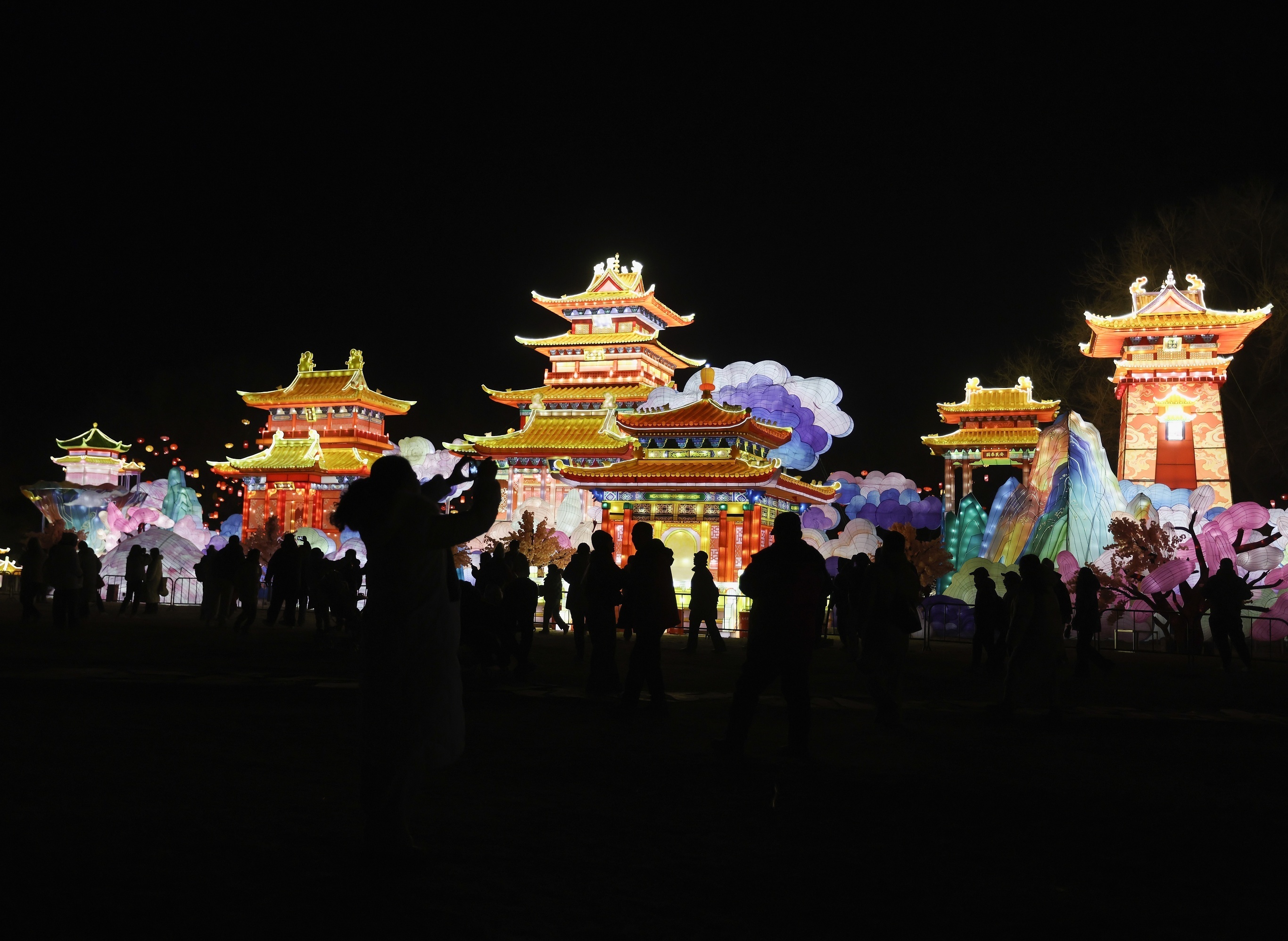 北京圆明园遗址公园举行2026新春灯会,中国。2月10日,圆明园遗址公园举办首届「灯影夜游」新春灯会,本届灯会以乾隆皇帝委托宫廷画师绘制的《圆明园四十景图》为主题,通过长达4.6公里的游览动线,呈现五大主题板块的逾40组大型灯组,主题包括海棠映春、戏韵凤冠、丹宸千灯、江山行舟、蓬壶月境等,重现乾隆时期的皇家灯节盛景。灯会将持续至3月3日。摄影师:Lintao Zhang