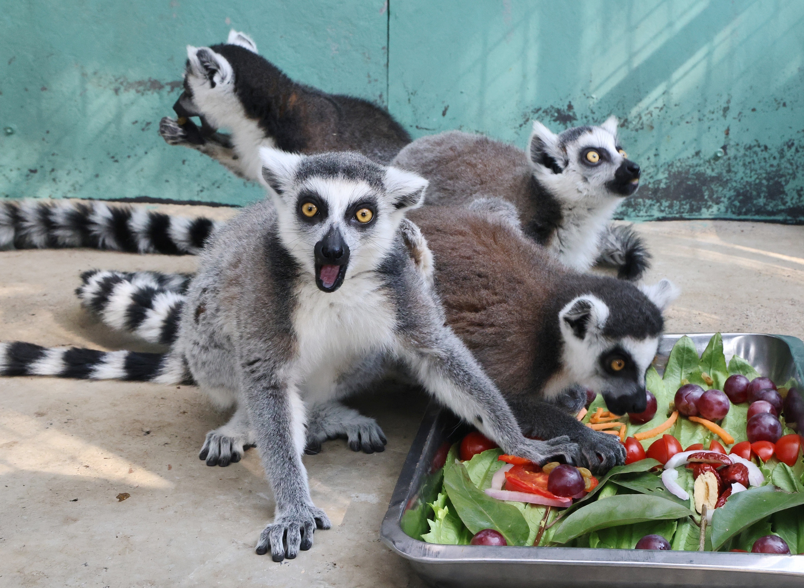 江苏南通森林野生动物园,一群环尾狐猴正在享用腊八节大餐,中国。1月23日,南通森林野生动物园使用各种水果和蔬菜为园内饲养的小熊猫、袋鼠、环尾狐猴、白脸僧面猴、黑熊等动物制作腊八节大餐。每年农历十二月初八是中国传统节日「腊八节」,该节日起源于中国古代岁末祭祀祖先和神灵的习俗,人们会在这一天吃不同谷物及果干制作的「腊八粥」进行庆祝。摄影师:iDaily Media