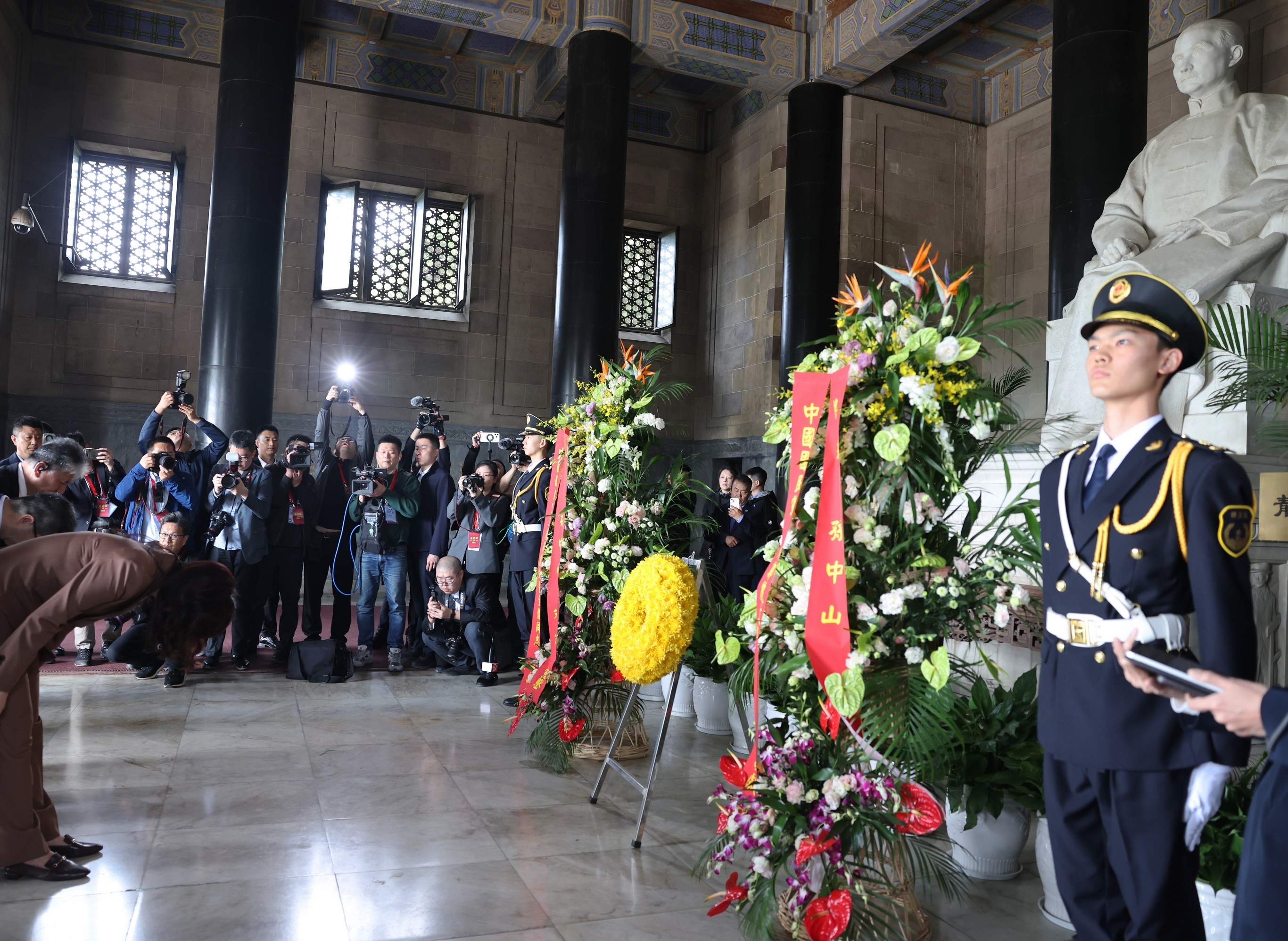 中国国民党主席郑丽文率访问团拜谒中山陵,南京。4月7日,中国国民党主席郑丽文应中共总书记习近平邀请,率国民党访问团赴江苏、上海、北京参访,行程为期6天,主要安排包括拜谒南京中山陵、会晤中国国家主席、游览北京故宫、参访大陆企业并与台商座谈等。这是中国国民党主席时隔10年再次率团访问大陆。国台办发言人表示,大陆方面愿意在坚持「九二共识」、反对「台独」的共同政治基础上,同包括中国国民党在内的台湾各政党、团体和人士一道,推动两岸关系和平发展。摄影师:Lu Mei