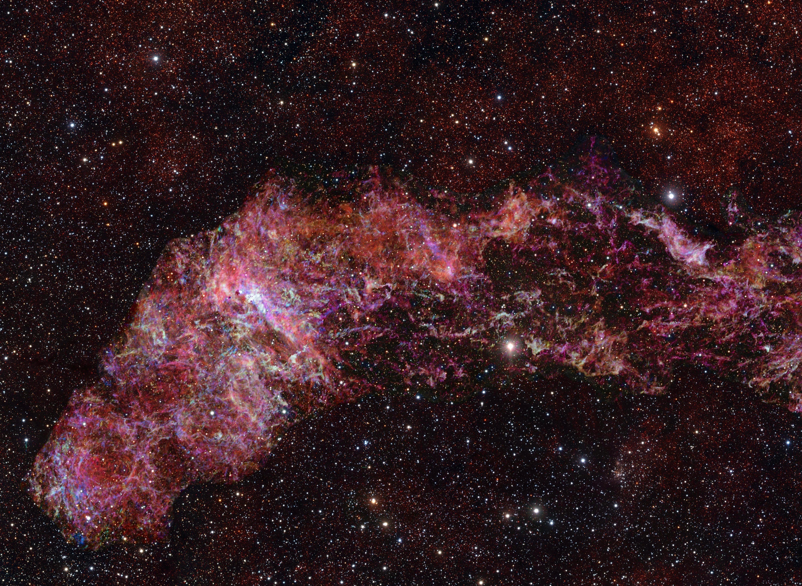 欧洲南方天文台公布一张智利阿塔卡马射电望远镜阵列拍摄的银河系中心分子区(CMZ)照片。这是阿塔卡玛射电望远镜迄今拍摄的最高清图像,覆盖区域跨度超过650光年,通过不同颜色呈现气体分子云的分布情况,其中一氧化硫呈青色、一氧化硅呈绿色、异氰酸呈红色、氰基乙炔呈蓝色、一硫化碳呈品红色。摄影师:ESO