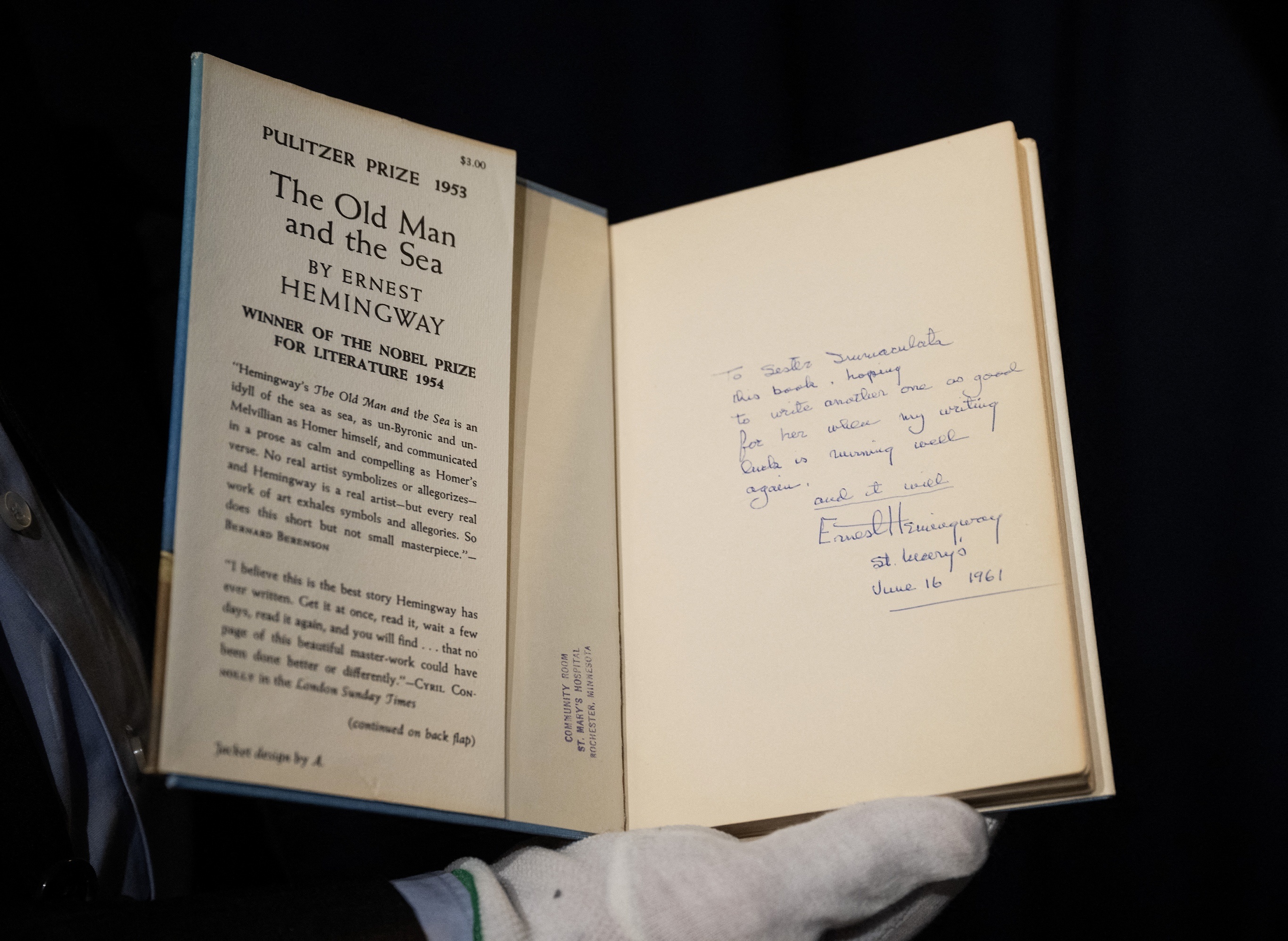 瑞典诺贝尔博物馆举办海明威题字签名版的《老人与海》捐赠仪式,斯德哥尔摩。1月23日,美国明尼苏达州罗切斯特圣方济各修女会向瑞典诺贝尔博物馆赠送一本海明威亲笔题赠的《老人与海》。这本书由圣方济各修女会医院的图书馆收藏超过60年,是海明威1961年6月在明尼苏达州圣玛丽医院住院期间赠送给照顾他的护士的私人礼物,被认为是他生前签名的最后一本书册。书中题词写道:「赠予伊玛库拉塔修女:若我写作灵感再次涌现,定当再为她创作一部同样精彩的作品。此愿必成。」摄影师:Fredrik Sangberg