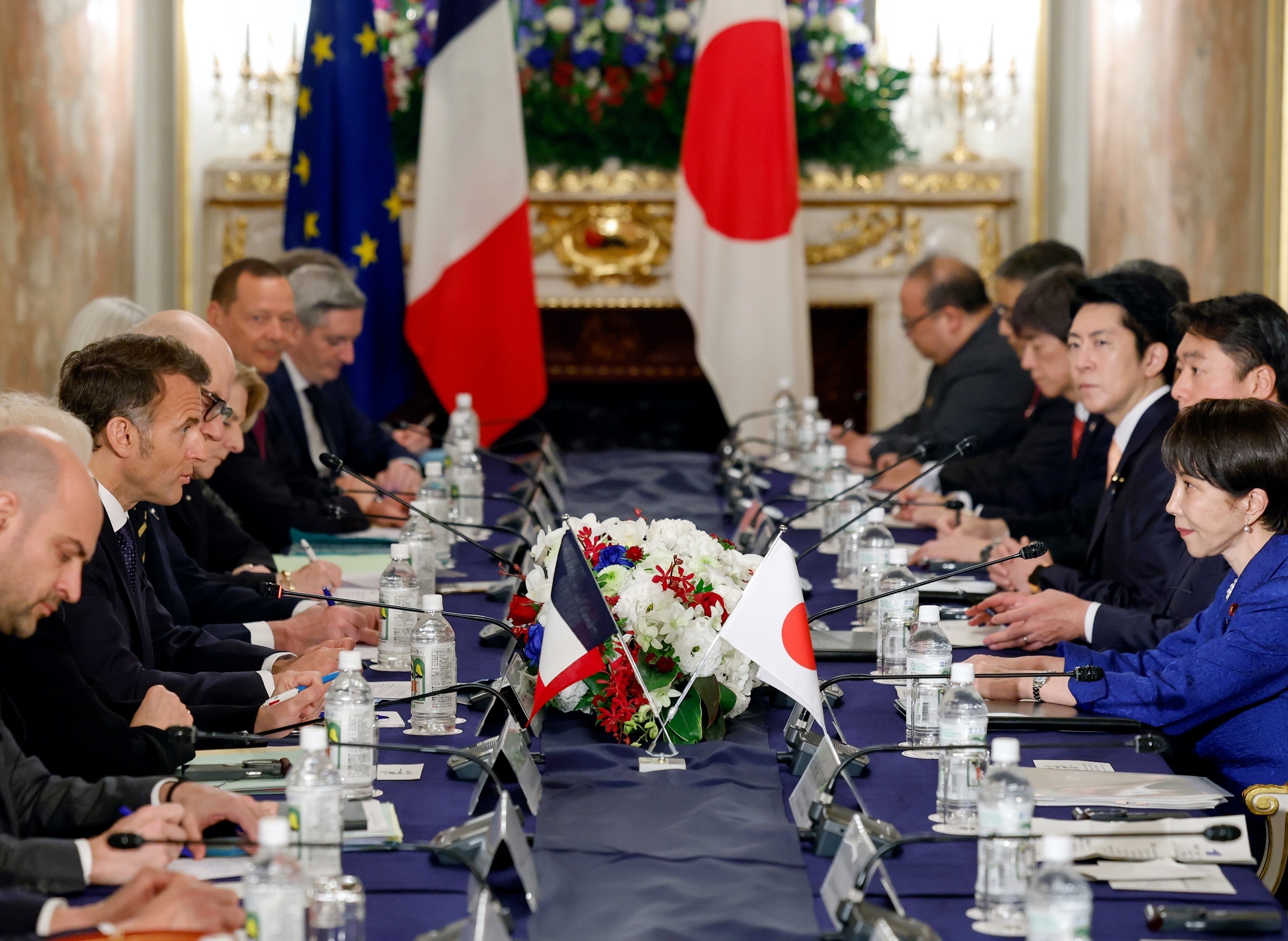 日本首相高市早苗与法国总统 Emmanuel Macron 在东京赤坂迎宾馆举行会谈。4月1日,法日两国领导人就双边合作、印太地区、伊朗局势和俄乌冲突议题进行会谈,时间持续2小时10分钟。双方会后发表联合声明,宣布就强化关键矿产供应链和稀土采购合作达成共识,同意推进核聚变技术合作和设立人工智能领域高级别对话机制,就推动中东局势平息及确保石油稳定供应保持密切沟通和协调。摄影师:Kim Kyung-hoon