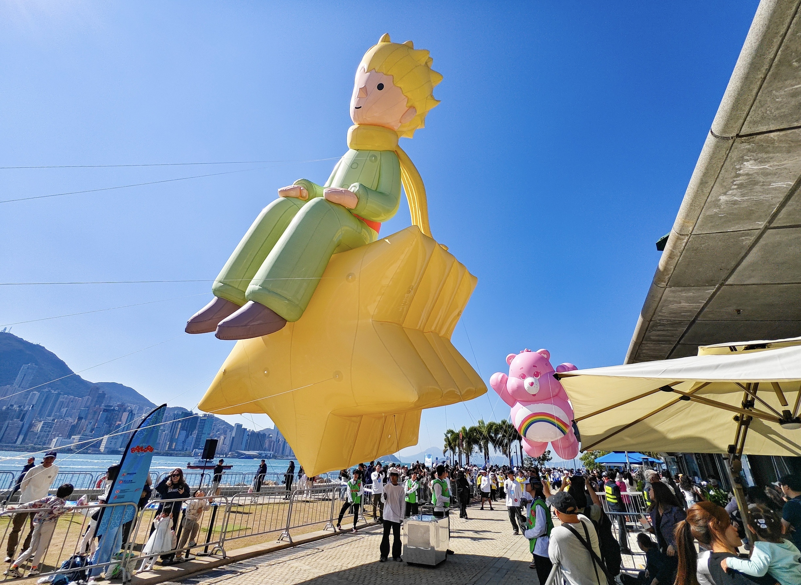 一只「小王子」造型的巨型气球穿过西九龙海滨长廊,中国香港。1月11日,香港西九龙文化区举行首届「Merry Balloon Parade」气球巡游活动,共有16个以本土和国际知名动画角色为形象的巨型气球参加游行,包括 LuLu 猪、小王子、加菲猫、海绵宝宝、奇先生妙小姐等,沿途吸引超过1万人观看。香港旅发局数据显示2025年前11个月共录得访港旅客超过4524.9万人次,同比增长12%,超过2024年全年总和,其中中国内地访港旅客同比增长11%至3447.9万人次,国际旅客同比增长16%至1077万人次。摄影师:Hou Yu
