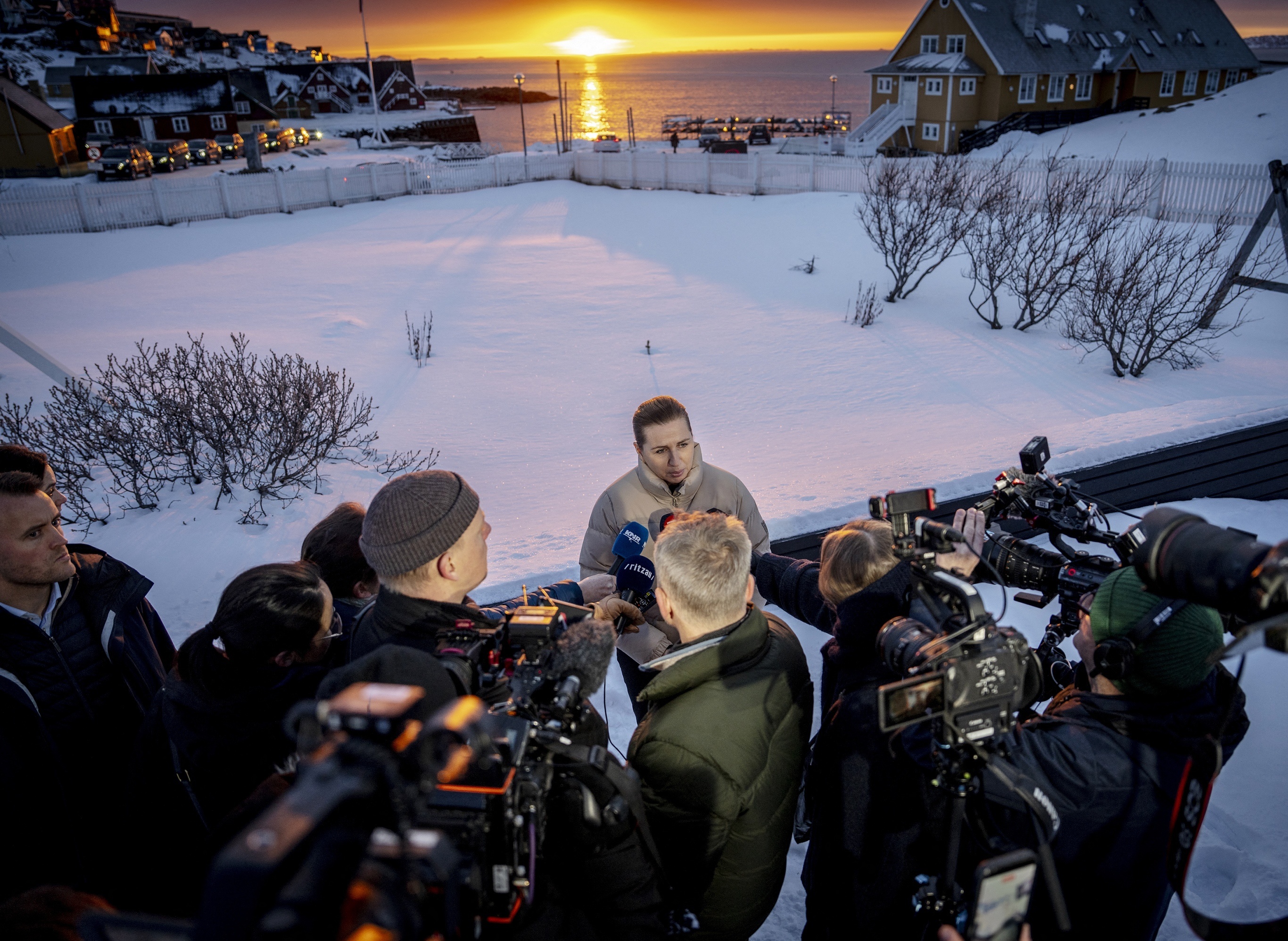 丹麦首相 Mette Frederiksen 在格陵兰岛日出时分接受媒体采访,努克。1月23日,丹麦首相 Frederiksen 亲自访问格陵兰岛首府努克市,她向媒体表示此行访问旨在表达对格陵兰岛人民的坚定支持,承诺将与格陵兰岛自治政府密切合作,通过外交和政治途径化解当前危机。丹麦国防部当天宣布在格陵兰岛启动「北极耐力」多国联合军事演习,参与国包括法国、德国、瑞典、挪威、芬兰等北约国家,演习将持续至2026年底。摄影师:Mads Claus Rasmussen