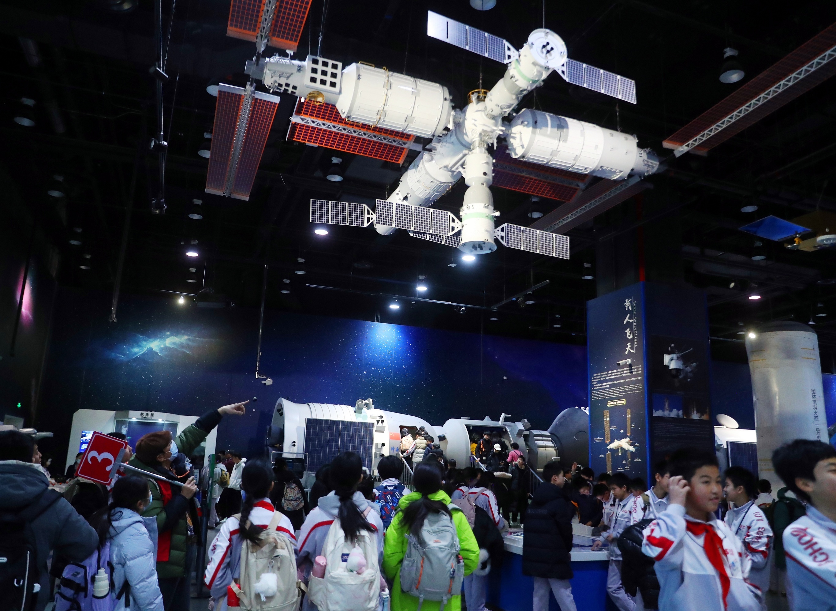北京市中小学生们正在参观中国科技馆的太空主题展厅。根据中国载人航天工程办公室公布消息,2026年中国将实施「神舟二十三号」、「神舟二十四号」载人飞船以及「天舟十号」货运飞船发射任务,1名航天员将开展1年以上长期驻留试验。中国自主研制的新一代可重复使用载人飞船「梦舟」将于2026年进行首次无人飞行试验,该飞船未来可搭载最多7名航天员进入近地轨道,开展载人登月和近地空间站任务。摄影师:iDaily Media