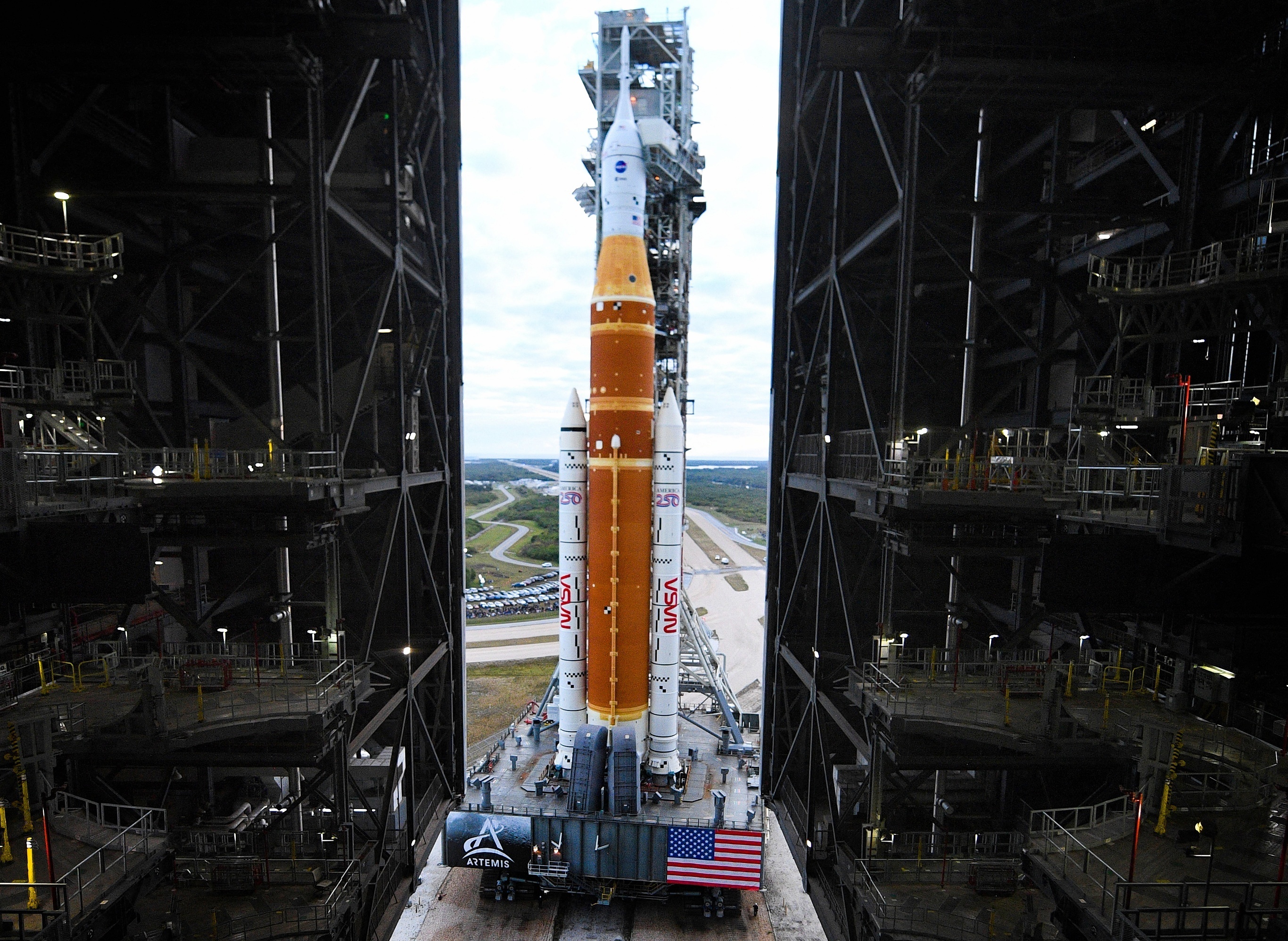 「阿尔忒弥斯2号」(Artemis II)载人绕月任务使用的太空发射系统火箭与猎户座飞船组合体垂直转运至发射区,佛罗里达州。1月17日,「阿尔忒弥斯2号」任务火箭飞船组合体从装配大楼垂直转运至发射台,正式进入发射前的湿排练阶段,包括加注推进剂、模拟发射倒计时等环节。NASA 计划最早于2月6日执行本次绕月任务,乘组人员包括美国宇航员 Reid Wiseman、Victor Glover、Christina Koch 和加拿大宇航员 Jeremy Hansen,这4名宇航员将绕月飞行10天后返回地球。摄影师:Jim Watson
