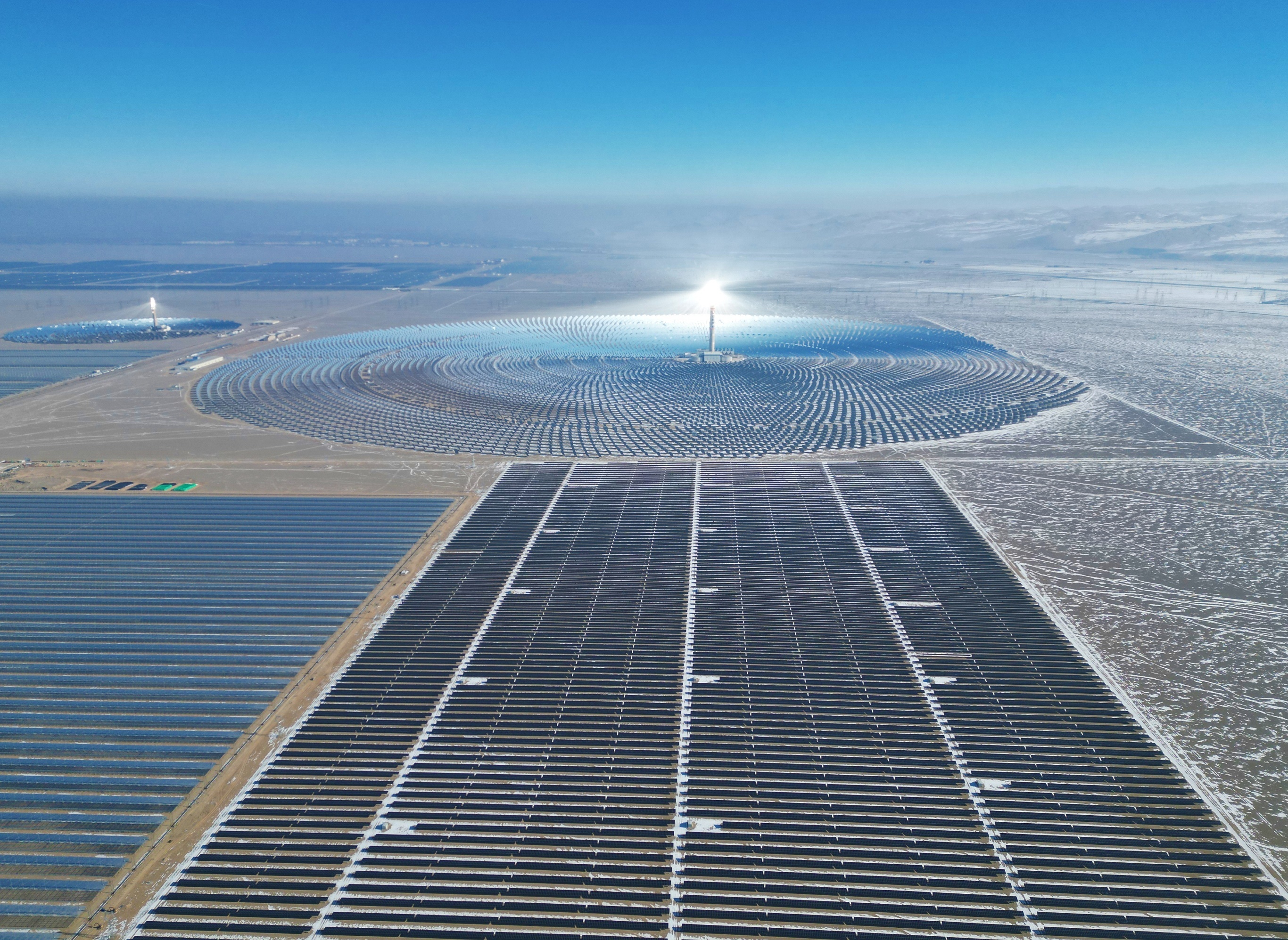 远眺敦煌市光伏基地与熔盐塔式光热电站,甘肃省。国家电网敦煌市供电公司数据显示,2025年敦煌市电源总装机容量达434万千瓦,均为风、光、水等可再生能源,首次实现全年全域100%绿电供应;全年新能源发电达40亿千瓦时,本地仅消耗7.49亿千瓦时,剩余通过境内沙洲变电站送出。中国2025年前三季度可再生能源新增装机3.1亿千瓦时,同比增长47.7%,约占新增装机的84.4%。摄影师:Li Yalong