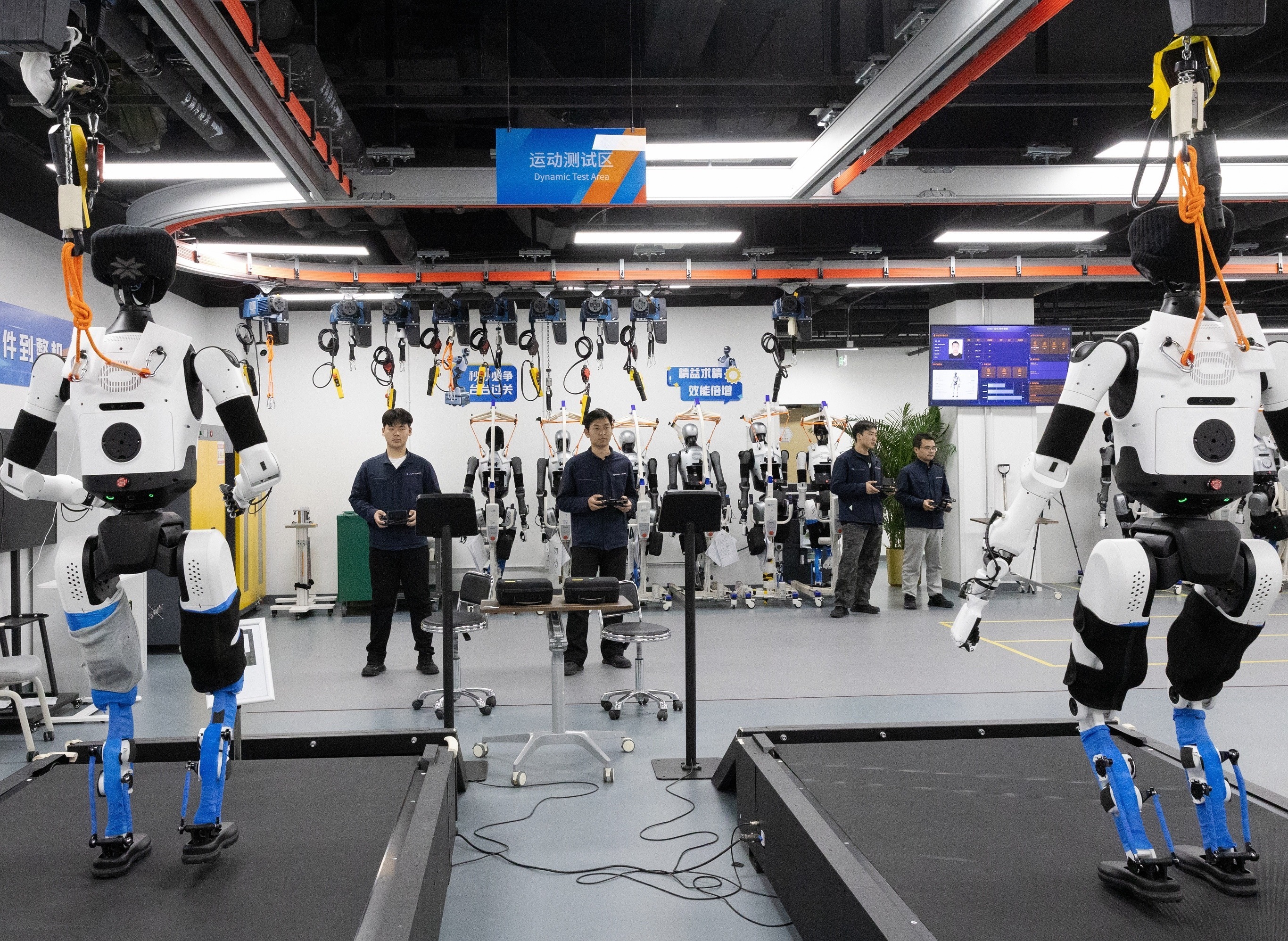 北京人形机器人创新中心,工作人员正在通过跑步机训练二足机器人。3月19日,北京人形机器人创新中心举行媒体开放日活动。这座机器人训练基地于2025年11月建成投运,占地面积约5000平方米,提供家居、商超、办公、工业、医药、康养等领域30余个训练场景,现有超过120台主流机器人机型,是中国场景覆盖最齐全、机器人构型最丰富的专业化数据采集中心之一。国际咨询公司 IDC 报告显示,2025年全球人形机器人出货量约为1.8万台,同比增长508%,中国机器人企业的份额占比接近90%。摄影师:Jessica Lee