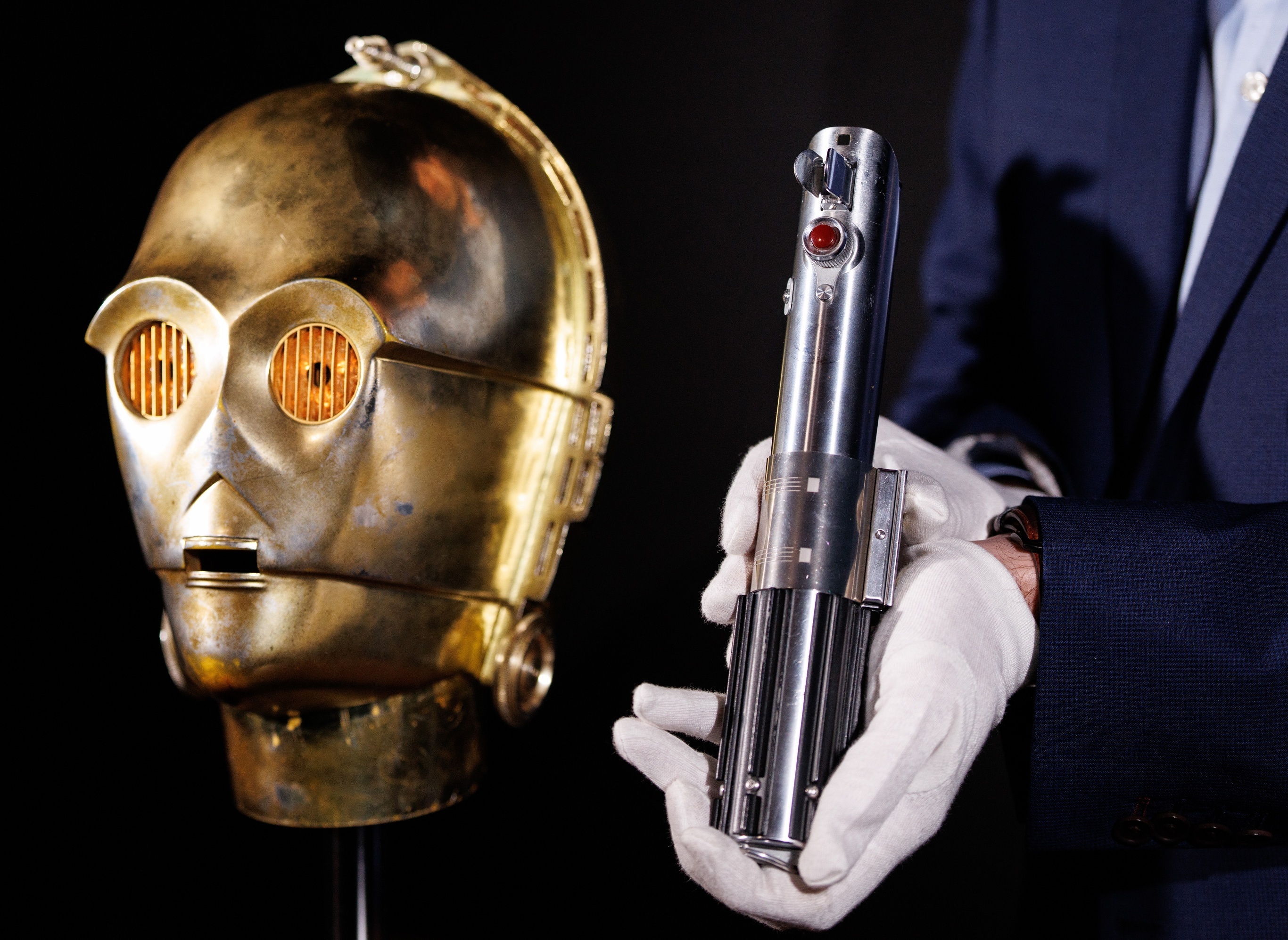 一名拍卖行工作人员展示《星球大战》电影 C-3PO 机器人头盔以及卢克·天行者使用的光剑道具。本次电影道具专场拍卖会将于3月25日至27日在洛杉矶举行,全场共计1550件拍品,涵盖电影道具、服装及相关纪念品,估价总额高达900万美元。亮点拍品包括《星球大战:帝国反击战》机器人「C-3PO」头盔、《哈利·波特与阿兹卡班囚徒》中的劫盗地图、《终结者》主演 Arnold Schwarzenegger 在电影中穿着的皮夹克等。摄影师:Tolga Akmen