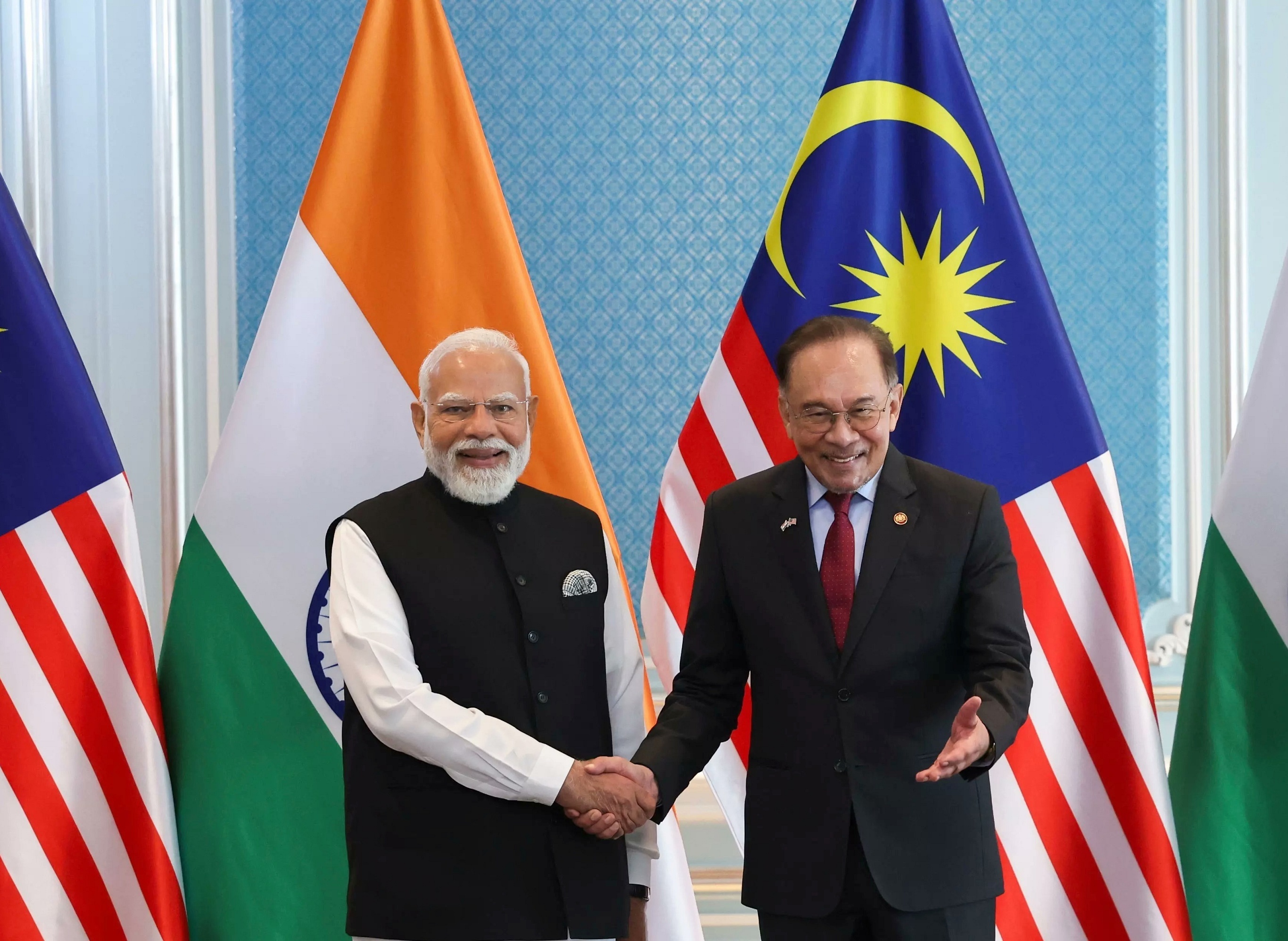 印度总理 Narendra Modi 与马来西亚总理 Anwar Ibrahim 举行会晤,布城。2月8日,印度总理 Modi 应邀对马来西亚进行为期2天正式访问,两国领导人就印马关系、经贸合作、国际及地区局势等议题交换意见,见证签署11份谅解备忘录和合作文件。双方会后发表联合声明,同意加强贸易便利化和本币结算,扩大能源、半导体、数字经济、国防安全等领域合作。印度是马来西亚在南亚的最大贸易伙伴,2025年两国双边贸易额达794.9亿令吉(约合200亿美元)。摄影师:Hasnoor Hussain