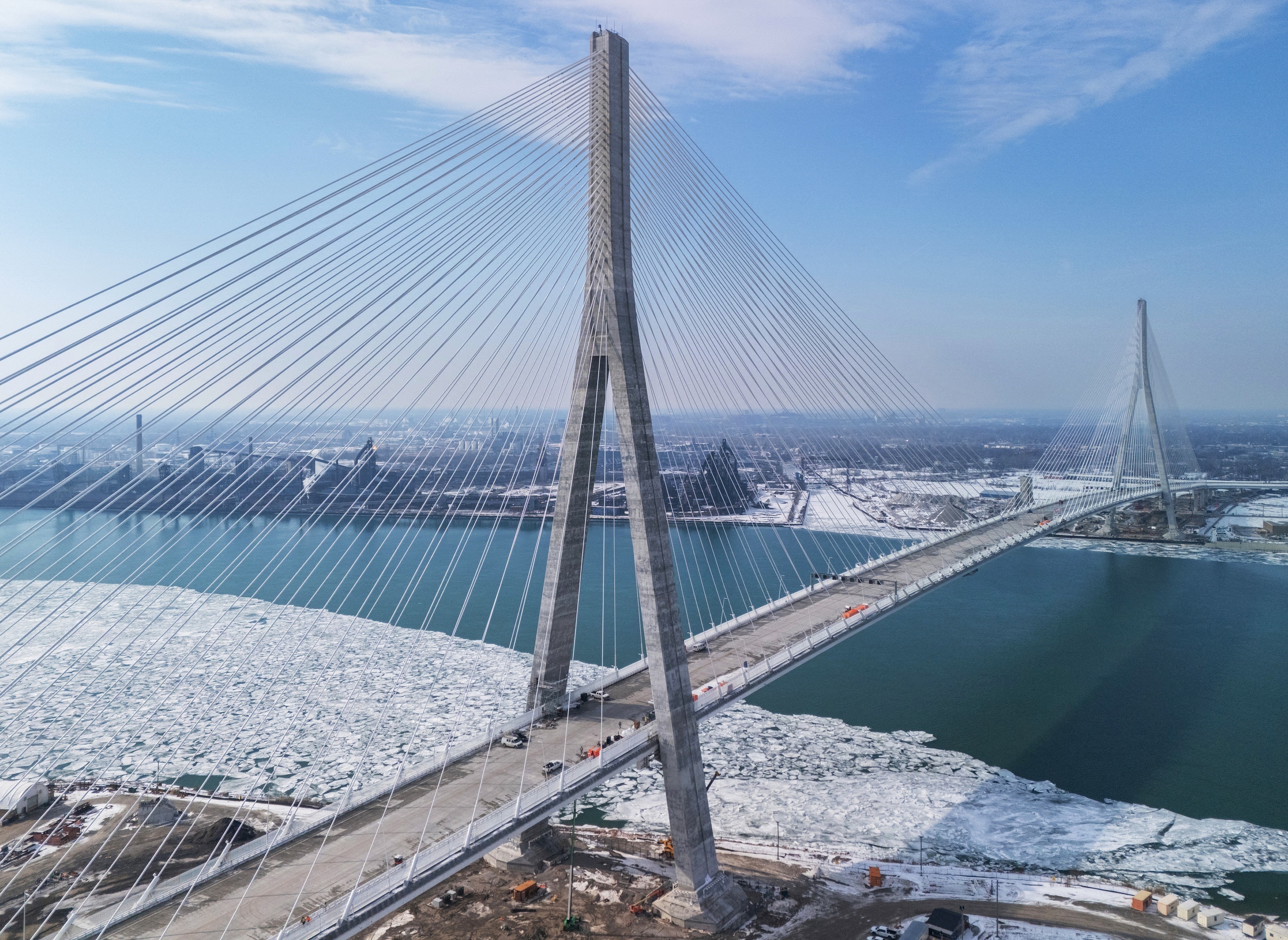 眺望建设中的戈迪·豪跨国大桥,加拿大安大略省。2月9日,美国总统 Donald Trump 在社交媒体发文要求加拿大政府将连接美加两国的戈迪·豪跨国大桥的一半产权提供给美国政府,否则将阻止这座大桥正式通车。戈迪·豪跨国大桥于2018年开工建设,投资总额64亿加元,由加拿大政府全额出资,主要用于连接加拿大安大略省与美国密歇根州的陆运交通,原计划2025年9月通车,建成后将成为美加边境最大的陆路口岸。加拿大总理 Mark Carney 回应指出,这座大桥所有权由美国密歇根州政府和加拿大政府各持50%,并不存在 Trump 声称的「加拿大占美国便宜」的情况。摄影师:Dax Melmer