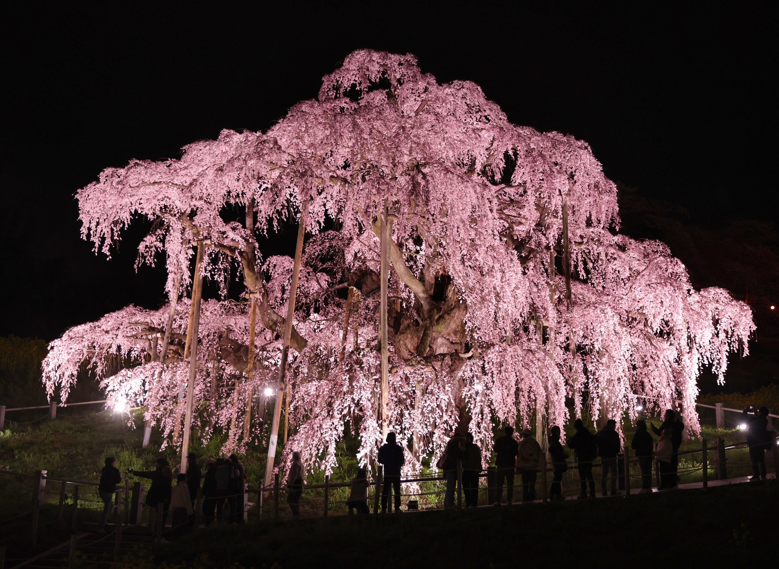 游客们在夜间观赏千年樱花树「三春泷樱」,福岛县。4月6日,日本千年古树「三春泷樱」迎来完全盛开期,比2025年花季提前6天。福岛县三春泷樱与山梨县神代樱、岐阜县淡墨樱并称日本三大樱花古树,推测树龄超过1000年。这棵古樱高13.5米,树冠宽度达25米,盛开时樱花如同瀑布倾泻而下,因此被命名为「泷樱」,每年花期吸引约30万人观赏。市场调查公司 Intage 公布报告显示,2026年日本民众赏樱平均预算为6383日元(约合40美元),同比下降-14%。摄影师:iDaily Media