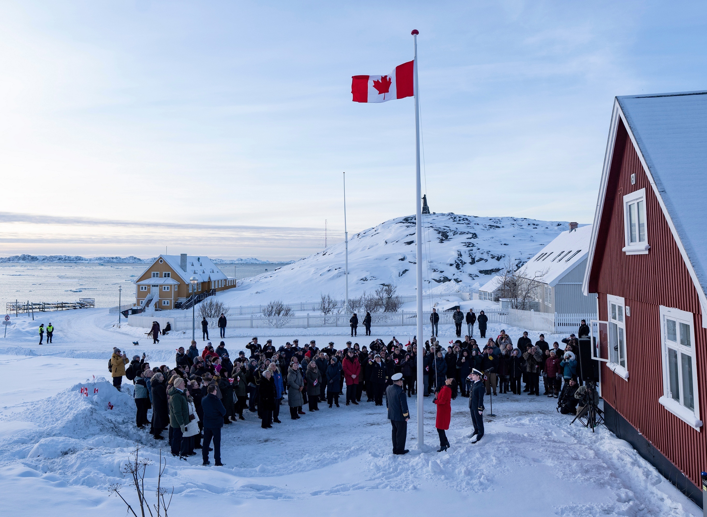 加拿大驻格陵兰岛领事馆举行开馆升旗仪式,努克。2月6日,加拿大和法国正式在格陵兰岛开设领事馆,成为继美国、冰岛之后第三和第四个在格陵兰岛设立领事服务的国家。加拿大外交部长表示新领事机构的成立彰显加拿大始终与丹麦及格陵兰岛人民站在一起的长期承诺;法国外交部在声明重申法国尊重丹麦的领土完整。最新民调显示,受到美国总统 Donald Trump 威胁吞并格陵兰岛的言论影响,丹麦民众对美国持负面看法的比例已攀升至84%。摄影师:Christinne Muschi