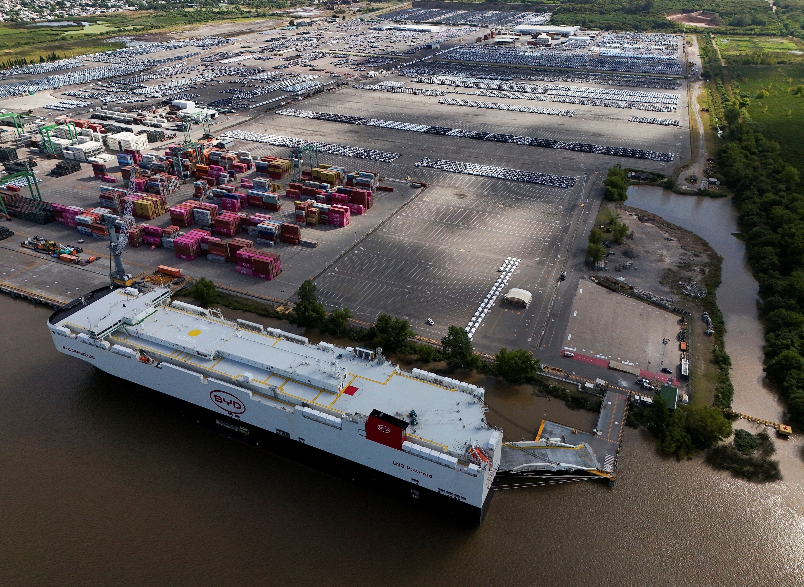 中国车企比亚迪旗下的「常州号」汽车滚装船停靠在阿根廷萨拉特港。1月19日,比亚迪「常州号」在萨拉特港卸载超过5800辆纯电和混合动力车,创下阿根廷进口新能源汽车单次最大规模纪录。比亚迪报告显示2025年该公司共销售汽车460.2万辆,同比增长7.73%,纯电动汽车销量超越特斯拉成为全球第一,海外年销量首次突破100万辆,同比增长145%,主要市场集中在欧洲、南美及东南亚。摄影师:Martin Cossarini