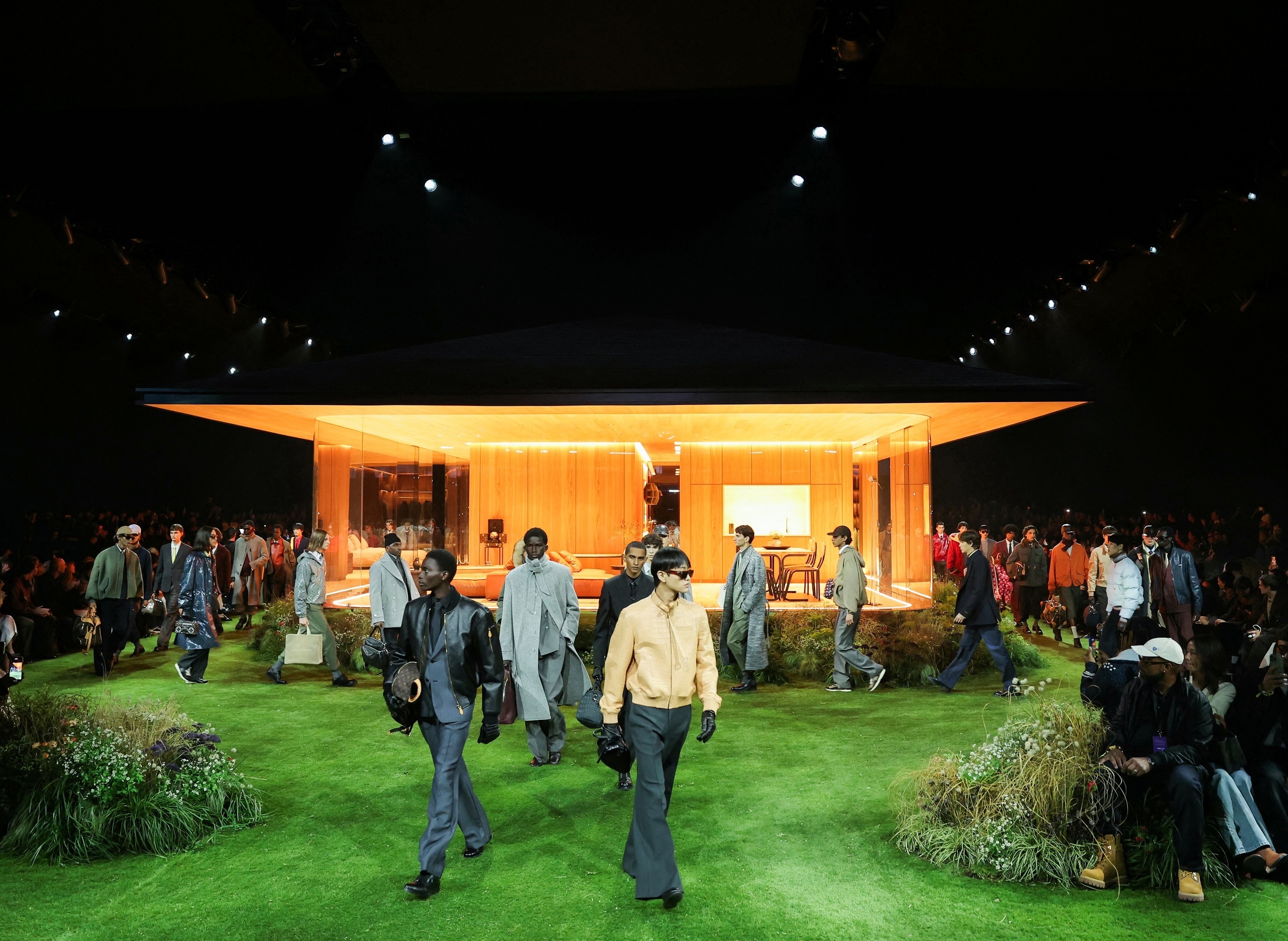 巴黎 2026 秋冬男装周 Louis Vuitton 秀场,模特们正在展示品牌男装创意总监 Pharrell Williams 的新一季男装作品,巴黎动植物驯化园。本季男装作品以「永恒」(Timeless)为主题,致敬1980年代人们对未来的想象。设计师采用科技面料焕新演绎双排扣西装、派克大衣、飞行夹克等男装经典单品,使其具备防水、超轻、夜间反光等功能特性,塑造优雅又前卫的「未来绅士」形象。摄影师:Thomas Samson