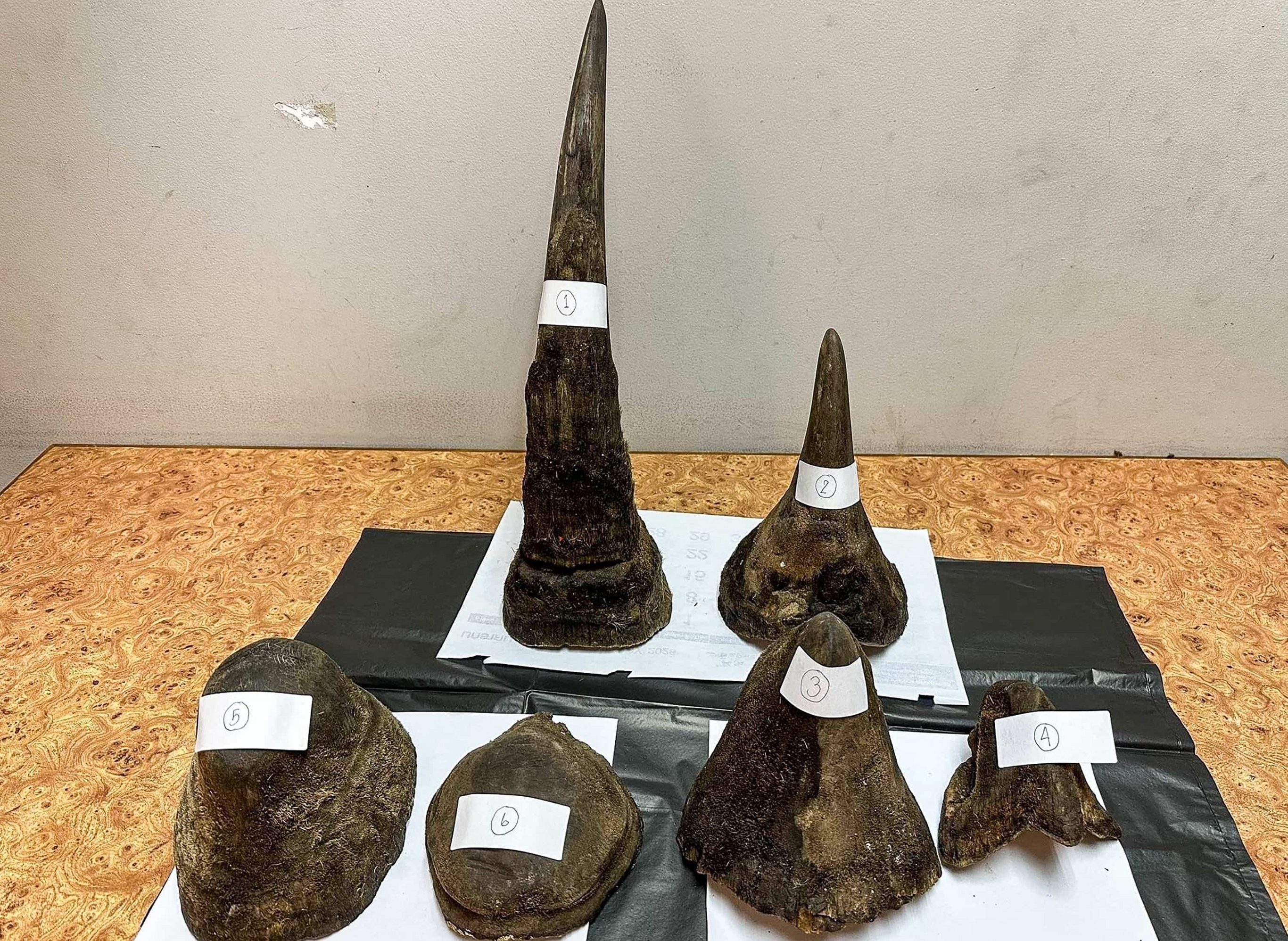 泰国国家公园和野生动植物保护局展示一批缴获的走私犀牛角,曼谷。2月9日,泰国海关在曼谷素万那普国际机场查获6件走私犀牛角,并逮捕一名36岁越南籍男子。这批犀牛角产自刚果民主共和国,被藏在冷冻肉中托运入境,原计划走私至老挝。泰国政府正在对这批犀牛角进行鉴定,若走私罪名成立,嫌犯将面临最高10年有期徒刑以及最高100万泰铢(约合3.2万美元)罚款。摄影师:Thailand DNP