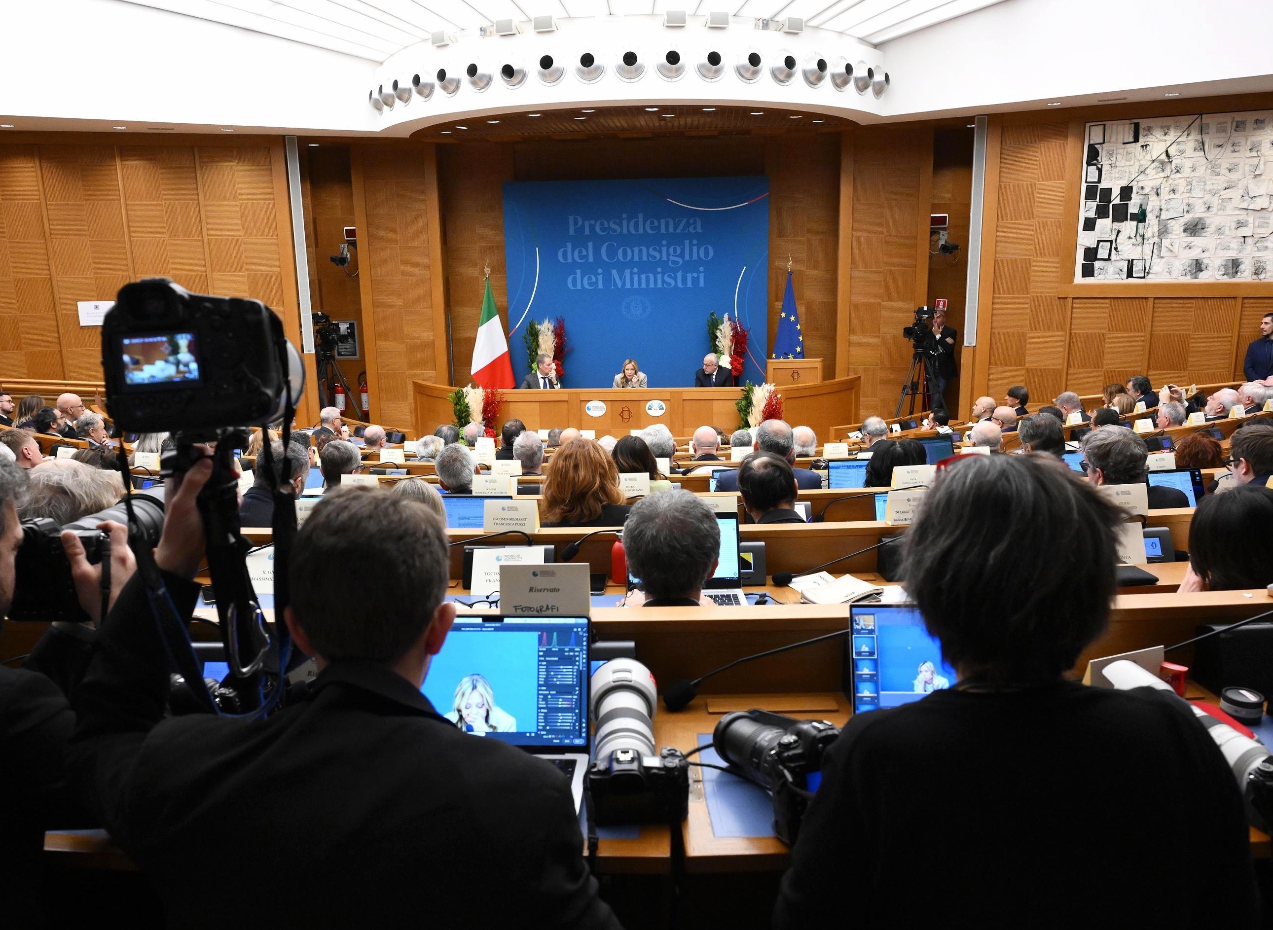 意大利总理 Giorgia Meloni 举行新年记者会,罗马。1月9日,意大利总理 Meloni 在持续3小时的记者会上就经济民生、俄乌冲突、委内瑞拉局势、美国总统涉格陵兰岛言论等议题发表观点。Meloni 将意大利经济疲软归因为德国工业危机和欧洲绿色政策的负面影响,强调将采取措施降低企业能源价格。Meloni 提议欧盟应恢复与俄罗斯的高级别对话,重申意大利不会随英法派兵进驻乌克兰。她表示理解美国对格陵兰岛「遭受其他敌意方干预」的担忧,但是不认为美国会采取军事手段夺取格陵兰岛。摄影师:Ettore Ferrari