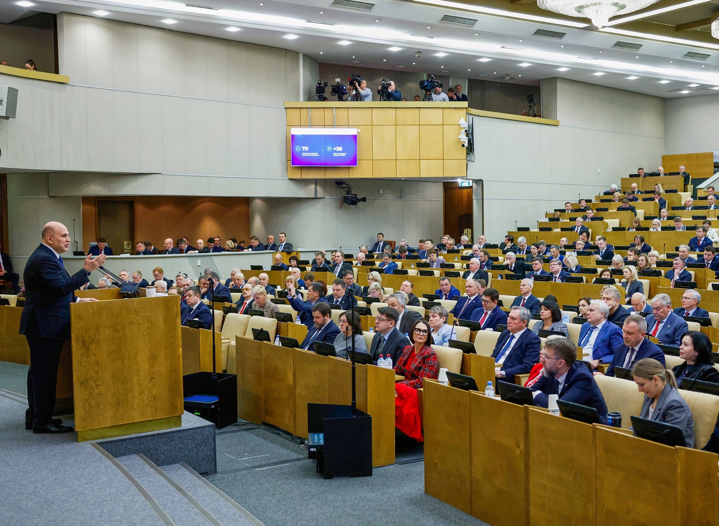 俄罗斯总理 Mikhail Mishustin 向国家杜马发表2025年政府工作报告,莫斯科。2月25日,俄总理 Mishustin 公布2025年俄罗斯 GDP 增长率为1%,通胀率降至5.6%,失业率保持在2.2%低位;2025年俄罗斯工业生产总体增长1.3%,农业增长近5%,粮食总产量达1.42亿吨,创下该国史上第三高产量纪录,特别军事行动武器装备供应量实现数十个百分点的增长,非原料和非能源产品出口额增加近9.5%,其中友好国家份额占比达86%。摄影师:Dmitry Astakhov
