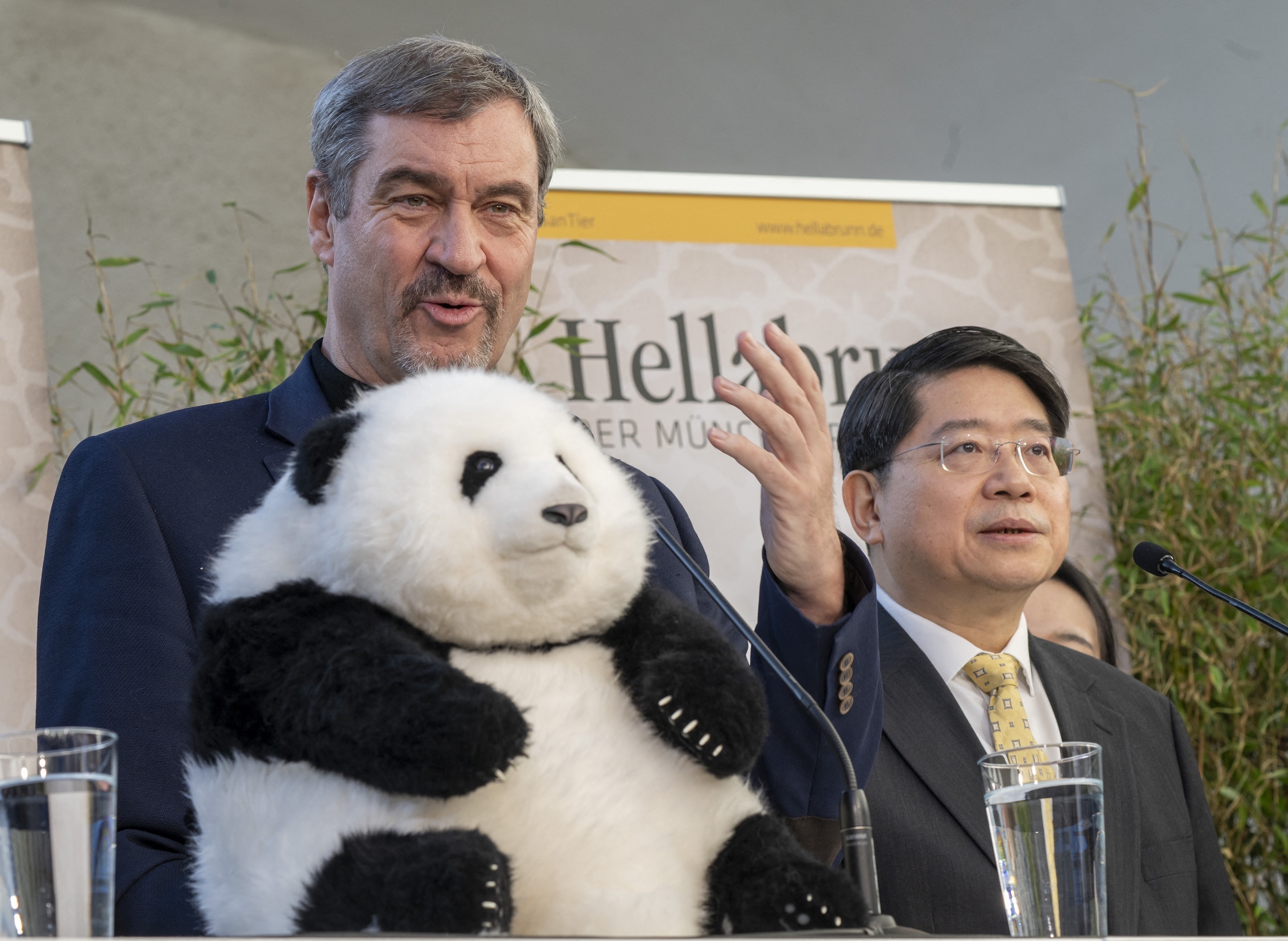德国巴伐利亚州州长 Markus Söder 与中国驻德大使邓洪波出席中德大熊猫保护国际合作协议签署仪式,慕尼黑。1月21日,中国野生动物保护协会与慕尼黑海拉布伦动物园签署大熊猫保护国际合作协议,宣布将从成都大熊猫繁育研究基地选定2只大熊猫赴德参与保护合作研究项目,预计为期10年。慕尼黑海拉布伦动物园宣布将在年内启动大熊猫馆建造工作,规划占地面积5000平方米,耗资1800万欧元,预计2028年初建成,届时该动物园将成为德国继柏林动物园之后第二家饲养大熊猫的动物园。摄影师:Peter Kneffel