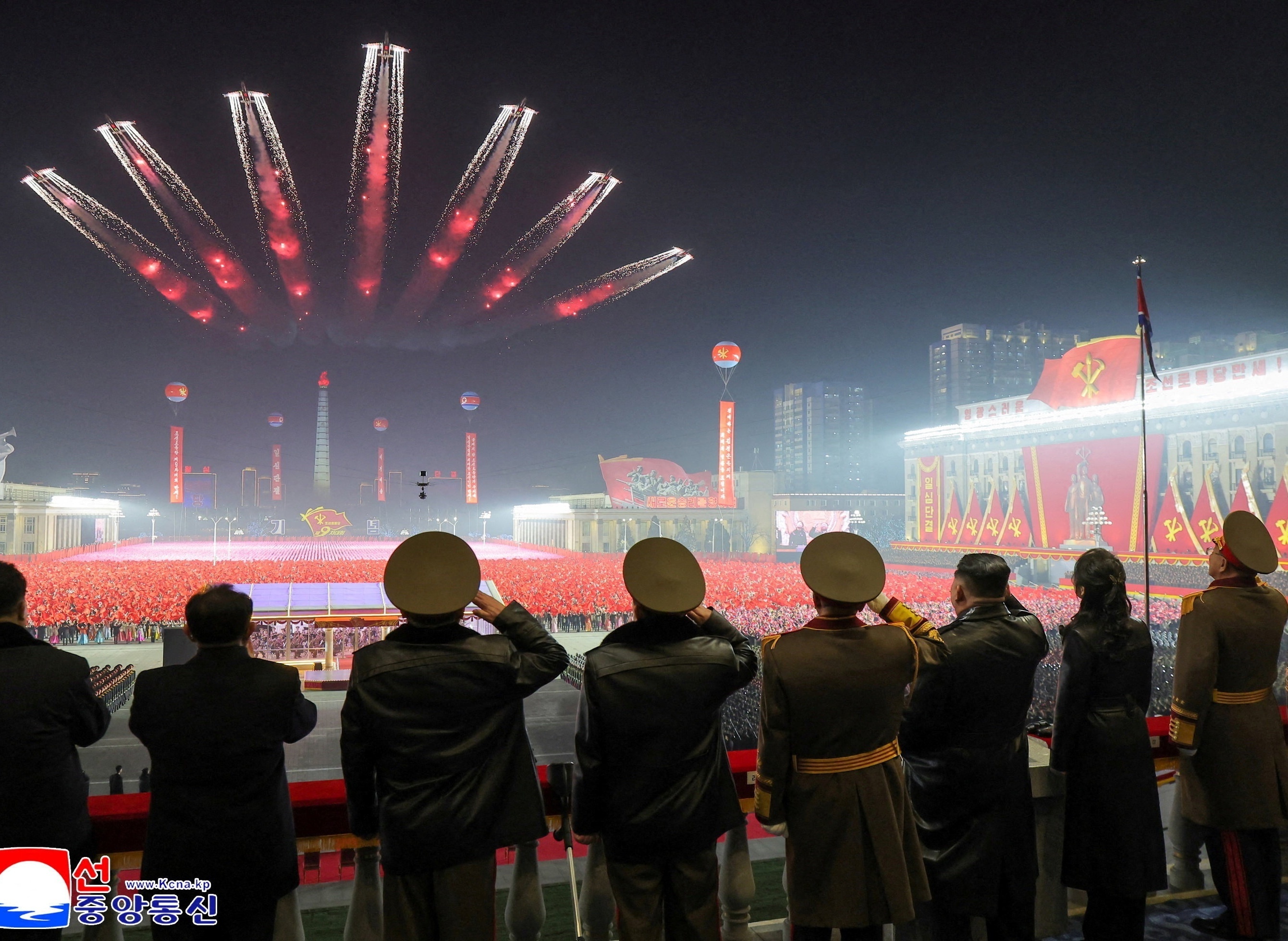 朝鲜最高领导人金正恩携女儿出席劳动党九大纪念阅兵式,平壤。2月26日,朝鲜劳动党第九次代表大会阅兵式在平壤金日成广场举行,参阅部队包括来自朝鲜各兵种的50个徒步纵队和飞行纵队。金正恩在劳动党九大会议报告中指出,朝鲜将同韩国的关系定为「最敌对的国与国的关系」的立场始终不变,朝鲜将在同族这一范畴中永远删除掉韩国,把韩国视为彻头彻尾的敌对国家、永恒的敌人。金正恩宣布朝鲜未来将逐年加强国家核力量,重点增加核武器数量、扩大核作战手段和空间,加快部署已研制的新型武器,他强调美国与生俱来的敌朝视角和把强权化为体制的流氓本性丝毫没有变化,除非整个世界完全变化,朝鲜绝不会放弃核武器。摄影师:KCNA