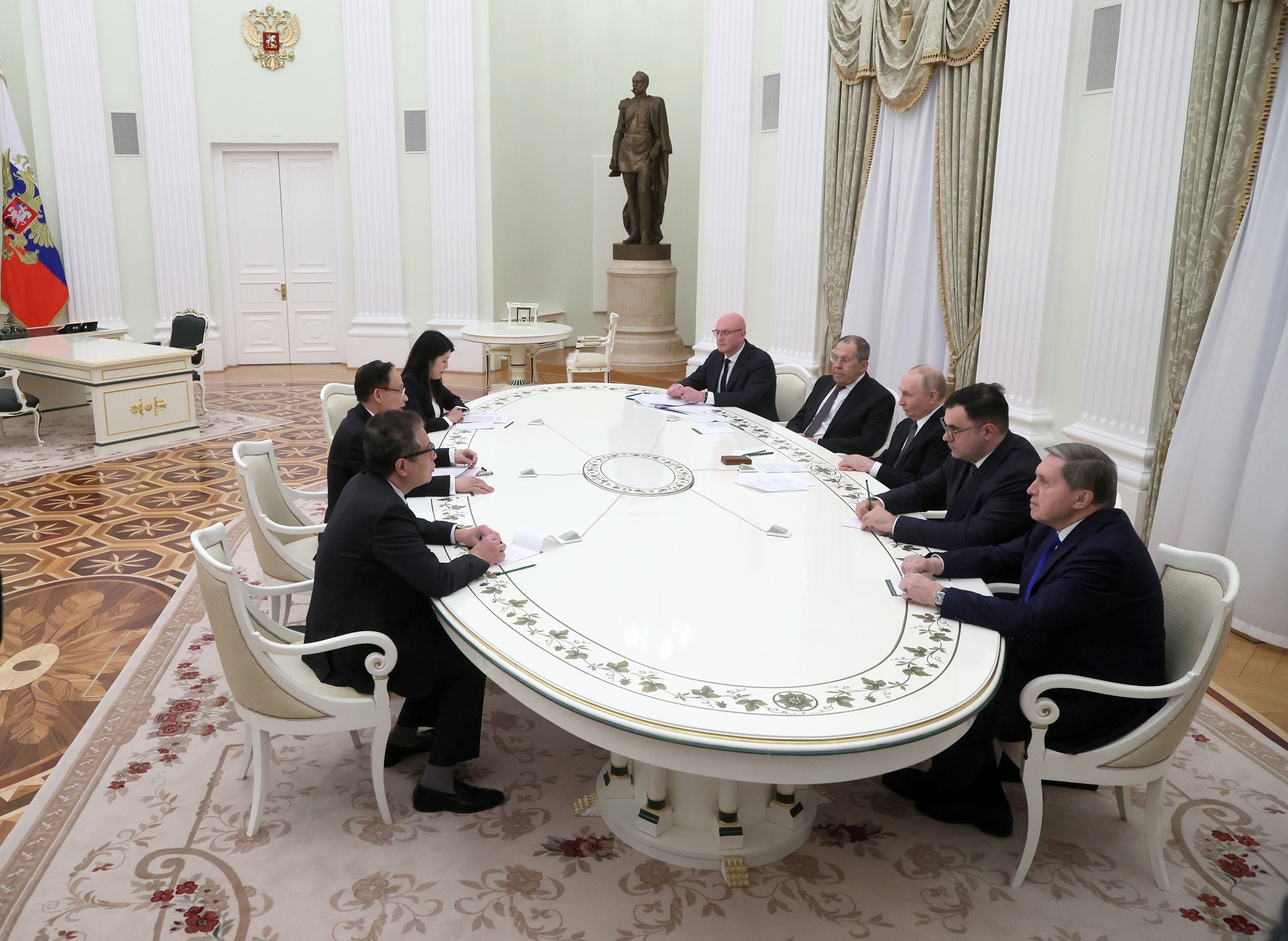俄罗斯总统 Vladimir Putin 接见越南外交部长黎怀忠,莫斯科。2月24日,俄总统 Putin 在克里姆林宫接见作为越共中央总书记特使来访的黎怀忠,听取有关越共「十四大」成果的通报。Putin 指出,俄越双边关系处于积极发展阶段,贸易额不断增长,两国在各个领域都保持着实质性公开对话。黎怀忠强调,越俄彼此有牢固的政治互信,越南始终将对俄关系置于优先位置,相信其具有战略及长远意义,并且希望将双边关系提升至更高水平。越南是俄罗斯在东南亚地区最大的贸易伙伴,2025年两国双边贸易额为48亿美元,同比增长4.1%。摄影师:Maxim Shipenkov