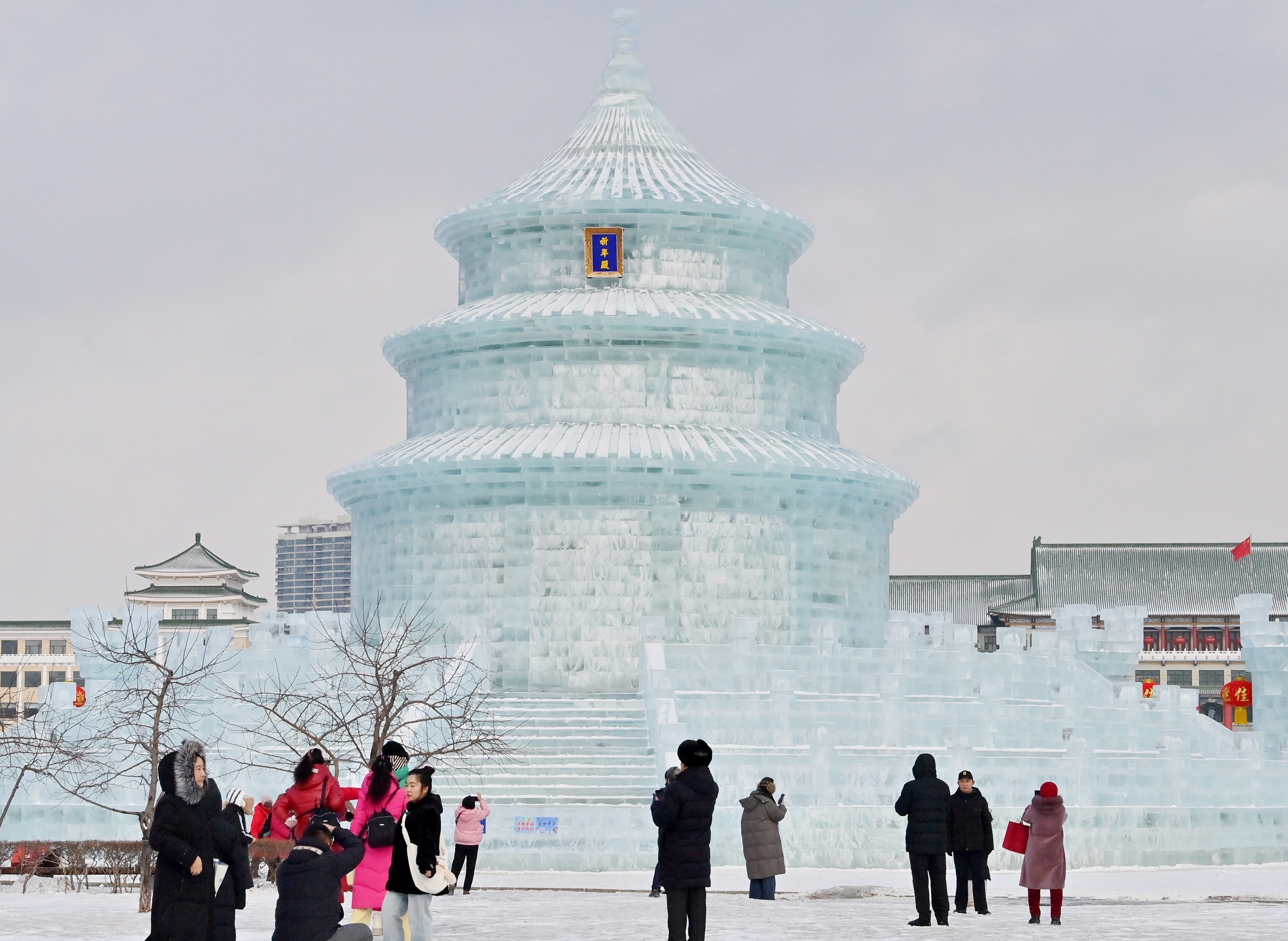 游客们在长春文化广场参观巨型「祈年殿」冰雕,中国吉林省。这座巨型冰雕以北京天坛祈年殿为原型,高约21米,用冰量超过5000立方米,精准复刻飞檐、殿顶等建筑细节。1月9日,中国国家统计局公布数据显示2025年居民消费价格指数(CPI)累计同比涨幅为0%,录得16年来首次零通胀;其中2025年12月全国居民消费价格指数同比上涨0.8%,涨幅比上月扩大0.1个百分点,回升至2023年3月以来最高水平,主要受到扩内需政策和临近新年居民消费需求增加推动。摄影师:Zhang Yao