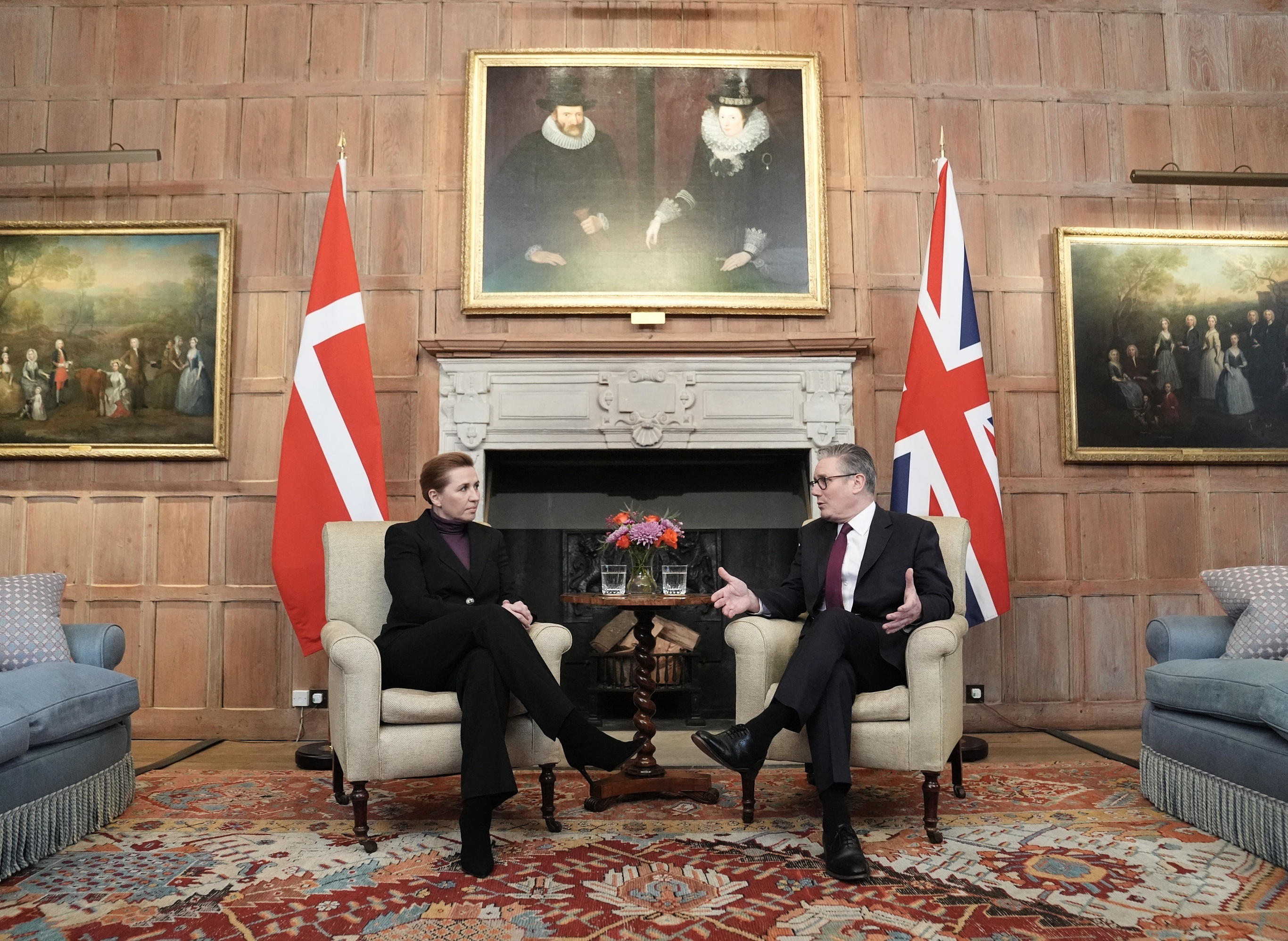 英国首相 Keir Starmer 与丹麦首相 Mette Frederiksen 举行会晤,白金汉郡。1月22日,英国与丹麦两国首相就北极地区安全、俄乌冲突、中东局势及移民问题举行会谈。丹麦首相 Frederiksen 当天发表声明强调北约无权代表丹麦和格陵兰岛与他国展开主权问题谈判,丹麦将在保障领土完整的前提下继续与盟友就北极安全进行建设性对话,包括在格陵兰岛部署美国「金穹」导弹防御系统等相关议题。摄影师:Stefan Rousseau