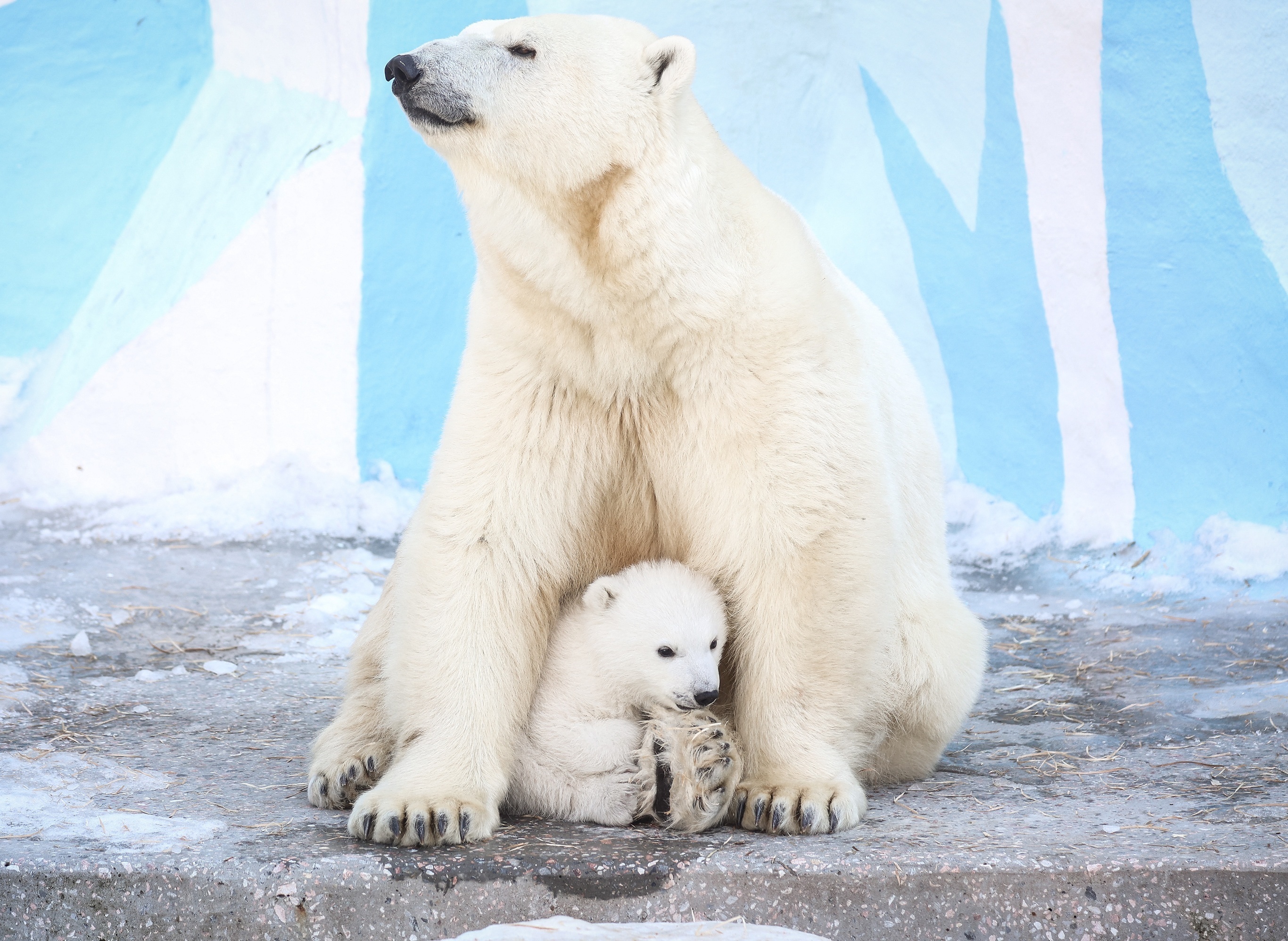 俄罗斯新西伯利亚动物园,一只出生约4个月的北极熊幼崽躲在母亲怀中。4月1日,新西伯利亚动物园宣布确认2025年12月新出生的北极熊幼崽性别为雄性,目前健康状况良好。这只小北极熊是园内北极熊夫妇「Kai」和「Gerda」诞下的第7只幼崽,出生后数月未离开巢穴,近期才开始跟随母亲进入室外活动。北极熊幼崽出生时平均体重仅600克,视力尚未发育,完全依赖母亲的保护与喂养,通常在2至3岁后开始独立生活。摄影师:Rostislav Netisov