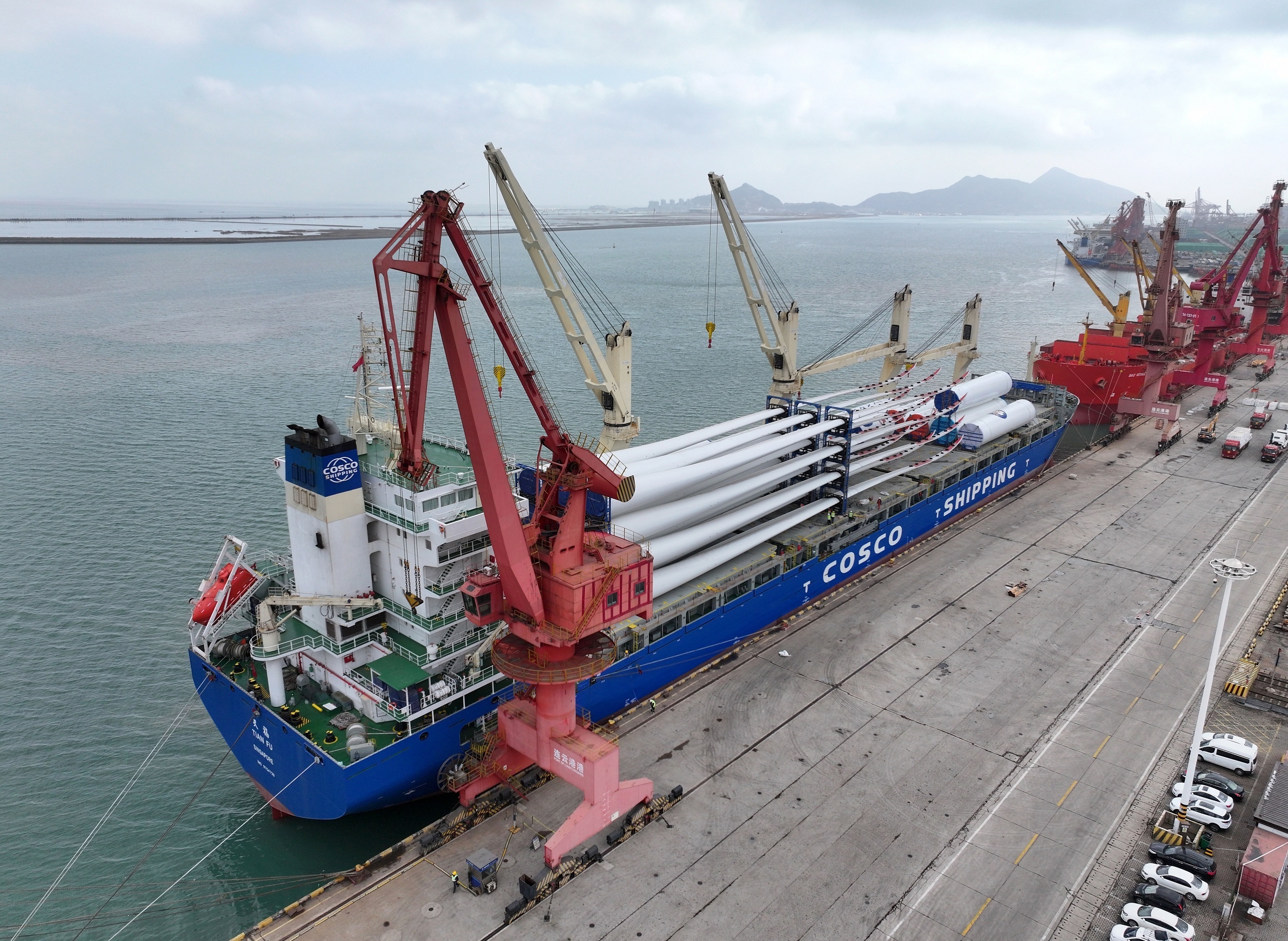 江苏连云港码头正在装载出口的中国制风电设备。中国可再生能源学会风能专业委员会(CWEA)数据显示,2025年中国风电机组新增出口1175台,容量达773.4万千瓦,同比大幅增长48.9%,其中陆上风电机组出口750.9万千瓦,海上风电机组出口22.5万千瓦。至2025年底中国风电机组累计出口容量超过2850万千瓦,出口至六大洲共60个国家,排名前三的市场依次为越南、沙特阿拉伯和埃及。摄影师:iDaily Media
