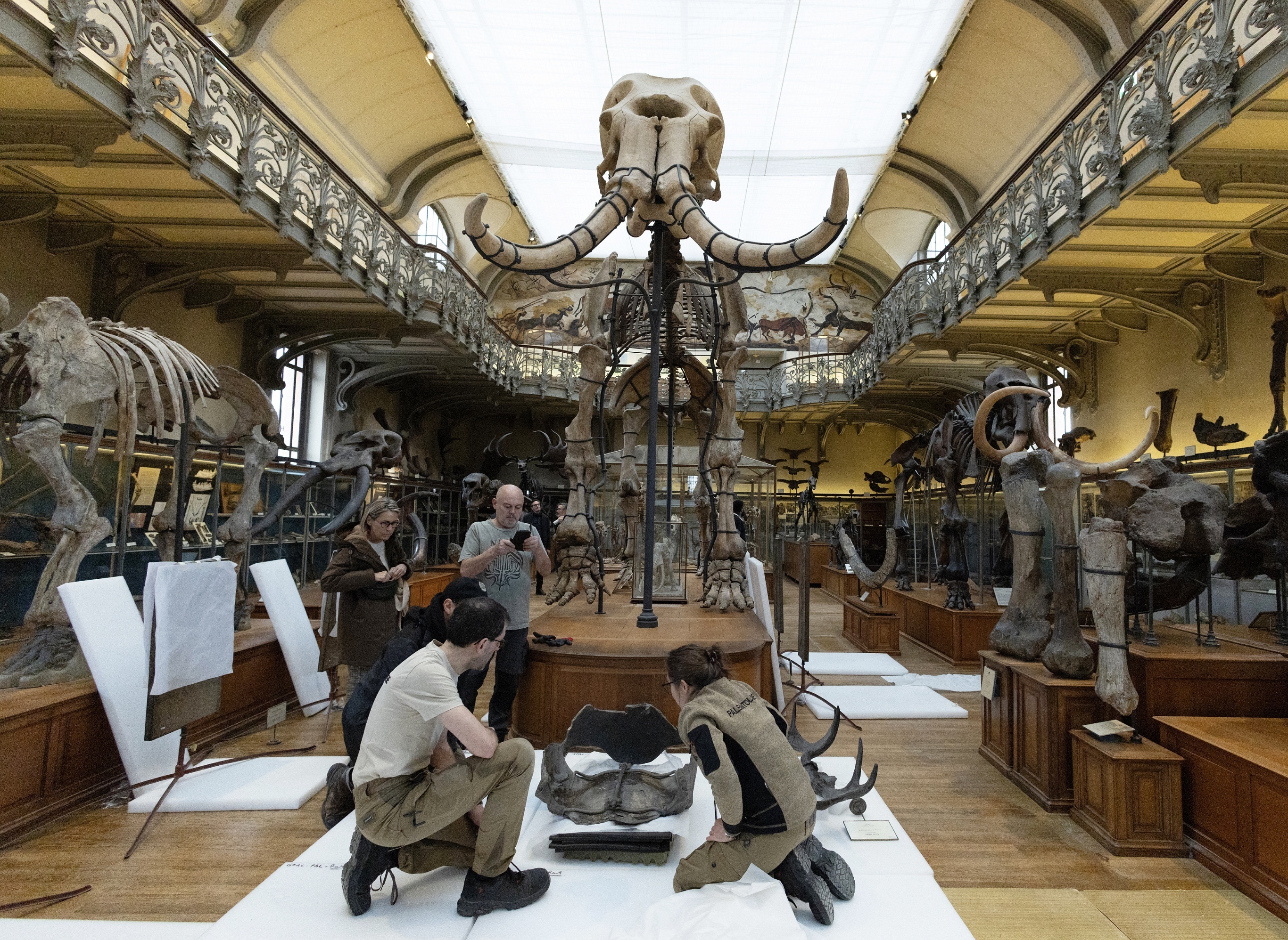 法国国家自然历史博物馆「古生物学与比较解剖学展馆」即将启动翻新工程,工作人员正在转移骨骼标本,巴黎。法国自然史博「古生物学与比较解剖学展馆」落成于1898年,收藏陈列着上万件脊椎动物、灭绝动物、无脊椎动物、古代植物标本,覆盖超过5.4亿年地球进化历史。该展馆从1月29日开始闭馆进行大规模现代化改造,主要项目包括升级消防安全系统、改善游客服务与藏品保护条件等,预计持续至2027年。摄影师:Alain Jocard