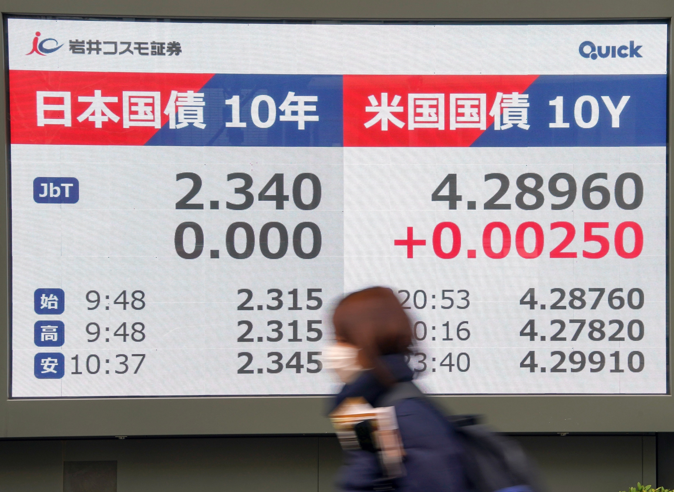 东京证券交易所屏幕上显示日美国债行情。1月20日,日本10年期国债收益率一度升至2.38%,达到自1999年2月以来最高位;40年期国债收益率创下4.215%历史新高。本次日本国债市场大幅波动主要与日本首相高市早苗提出的减免消费税承诺有关,引发市场对日本财政状况恶化的担忧。从2025年10月高市早苗担任日本首相以来,日本40年期国债收益率已累计上涨近60个基点。摄影师:Toru Hanai