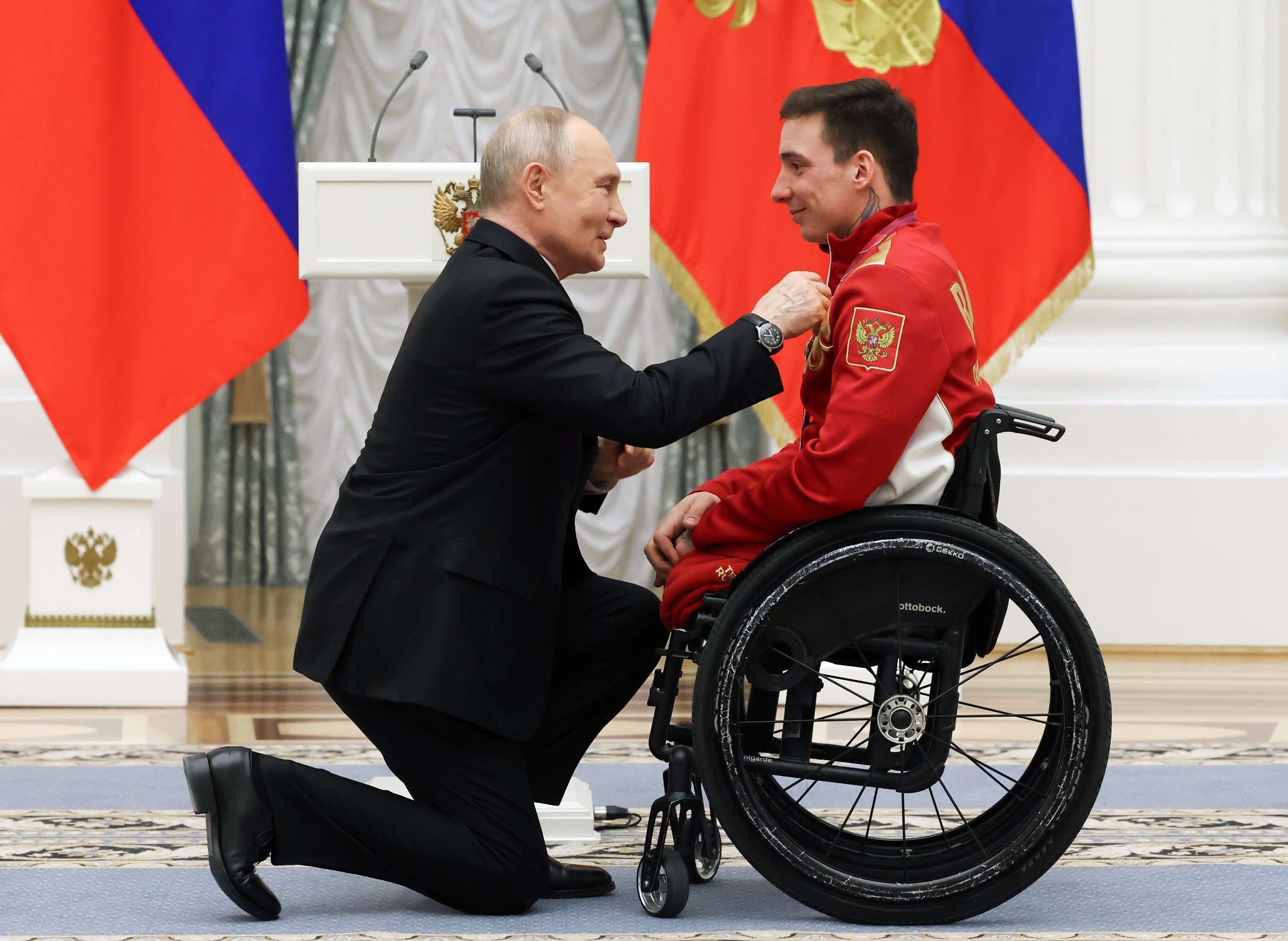 俄总统 Vladimir Putin 向残奥会越野滑雪运动员 Ivan Golubkov 颁授国家奖章,莫斯科。3月19日,俄罗斯总统 Putin 在克里姆林宫接见2026年米兰-科尔蒂纳冬残奥会获奖牌运动员并向其颁授国家奖章。Putin 祝贺俄代表队在本届冬残奥会取得非凡佳绩,称赞其向世界展示了残奥运动员崇高使命的真正意义。这是俄罗斯代表队自2014年索契冬奥会后首次以国家队身份参赛,共派出6名运动员,获得8金1银3铜共12枚奖牌,跻身奖牌榜第三位。摄影师:Vyacheslav Prokofyev