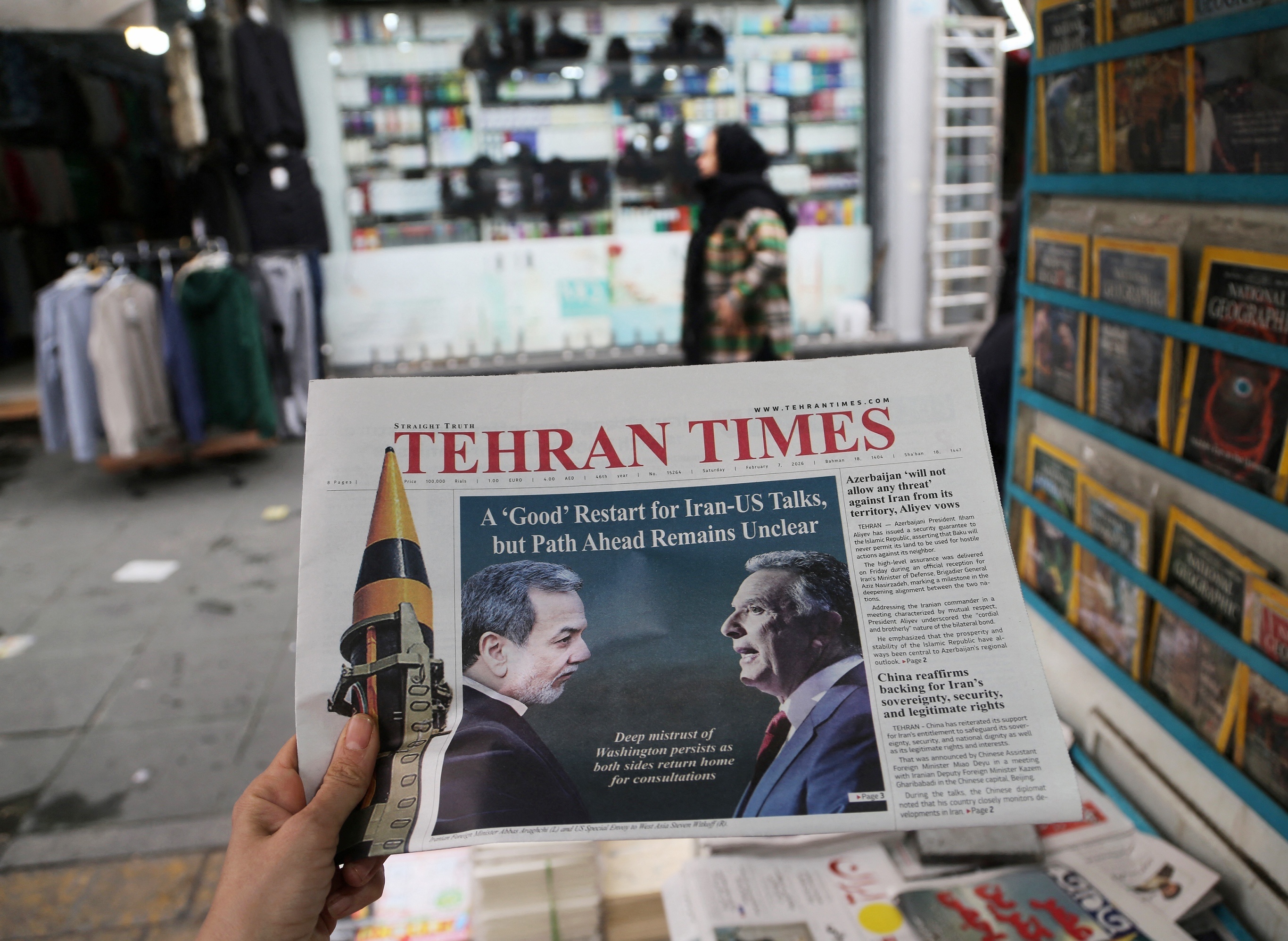 伊朗报纸头版刊登美伊重启核谈判的报道,德黑兰。2月6日,伊朗外交部长 Abbas Araghchi 与美国总统特使 Steven Witkoff 在阿曼首都马斯喀特进行首轮间接谈判,阿曼外交大臣负责在中间传递双方谈判立场。本轮谈判共持续8个小时,双方会后同意继续谈判。伊朗外长重申不会放弃铀浓缩的立场,亦不会就弹道导弹发展、地区代理人等问题进行谈判,并警告称如果该国遭受美国袭击,将对美国在中东的军事基地进行打击。美军中央司令部在社交媒体宣布林肯号航母打击群已驶入阿拉伯海地区。美国总统 Donald Trump 当天签署行政令称将对与伊朗有贸易往来的国家加征高达25%关税。摄影师:Fatemeh Bahrami