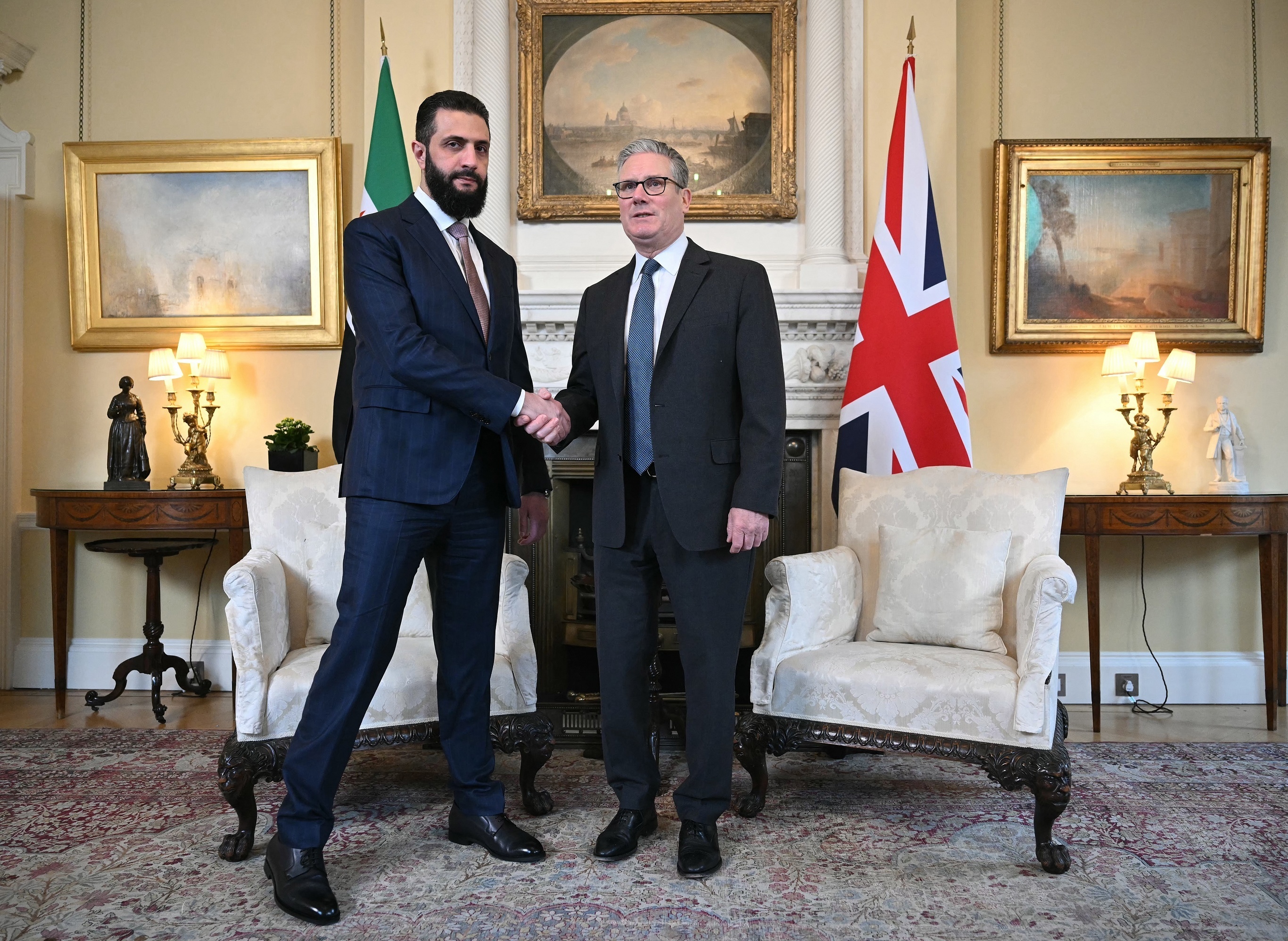 英国首相 Keir Starmer 与叙利亚过渡政府总统 Ahmed al-Sharaa 举行会晤,伦敦。3月31日,叙利亚总统 Ahmed al-Sharaa 上任以来首次访问英国,主要行程包括会晤英国国王查尔斯三世及首相。两国领导人就双边关系、中东局势、反恐合作、移民遣返等议题举行约1小时会谈。英国首相 Starmer 对叙利亚政府打击伊斯兰国残余势力以及两国反恐合作进展表示赞赏。叙利亚过渡政府总统 al-Sharaa 表示叙利亚的优先事项是稳定经济和重建国家,除非遭到入侵攻击,该国将避免卷入任何战争。摄影师:Justin Tallis
