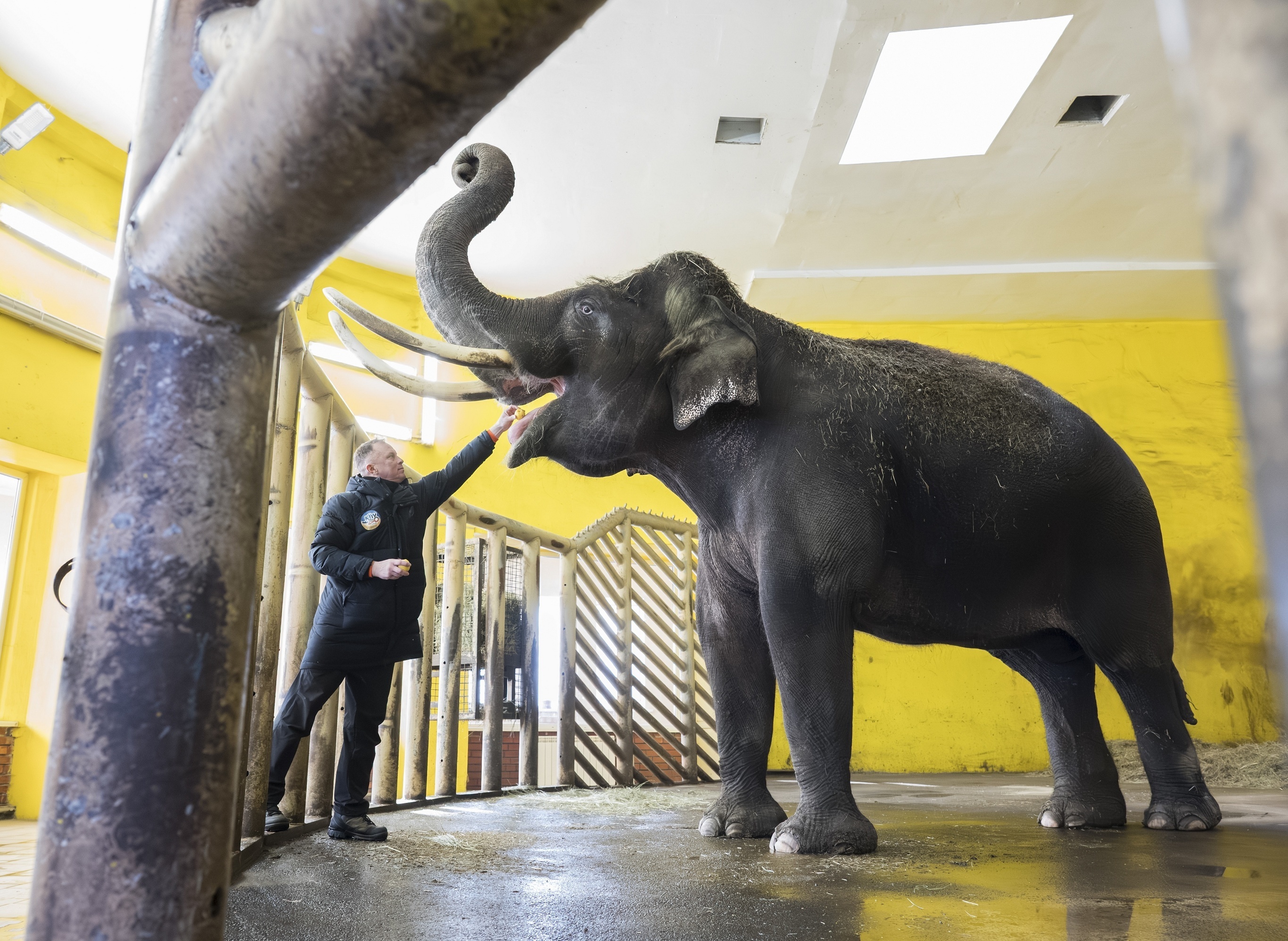 基辅动物园园长 Kyrylo Trantin 正在给一只大象喂食,乌克兰。1月19日,俄罗斯对乌克兰能源设施发动新一波大规模无人机袭击,导致苏梅州、敖德萨州、第聂伯罗州、哈尔科夫州和切尔尼戈夫州多地陷入停电。基辅市已宣布进入能源紧急状态,该市最大的动物园被迫使用柴火炉为动物取暖。乌克兰总统 Volodymyr Zelensky 指出目前乌克兰能源系统仅能满足全国约60%的用电需求。摄影师:Maxym Marusenko