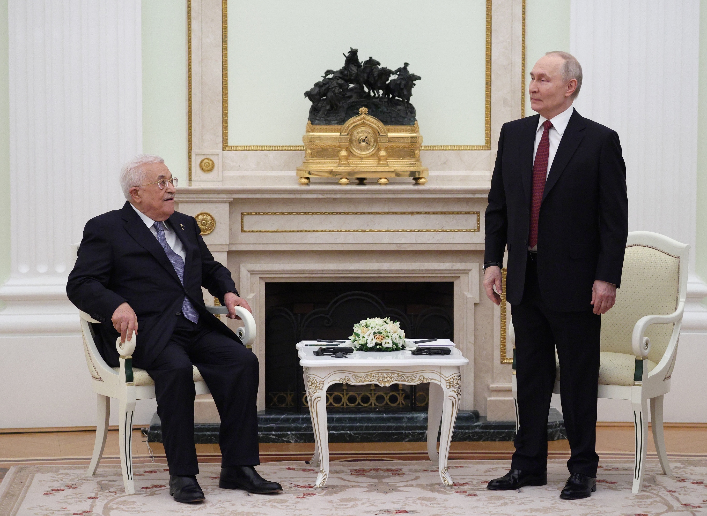 俄罗斯总统 Vladimir Putin 与巴勒斯坦总统 Mahmoud Abbas 举行会晤,莫斯科。1月21日,巴勒斯坦总统 Abbas 对俄罗斯进行为期2天工作访问,两国领导人就加沙和中东局势以及经贸、文化、人道主义等领域合作前景交换意见。俄总统 Putin 表示俄方致力于推动中东和平,认为巴勒斯坦建国和全面运作是解决中东冲突的唯一途径。Putin 指出俄巴双边贸易额在过去数年增长两倍,俄方愿继续与巴勒斯坦开展人道主义合作,并为巴方培养人才提供支持。巴勒斯坦总统 Abbas 对俄罗斯的援助和支持表示感激,强调巴勒斯坦人民将坚守自己的土地,努力实现和平与建国目标。摄影师:Ramil Sitdikov