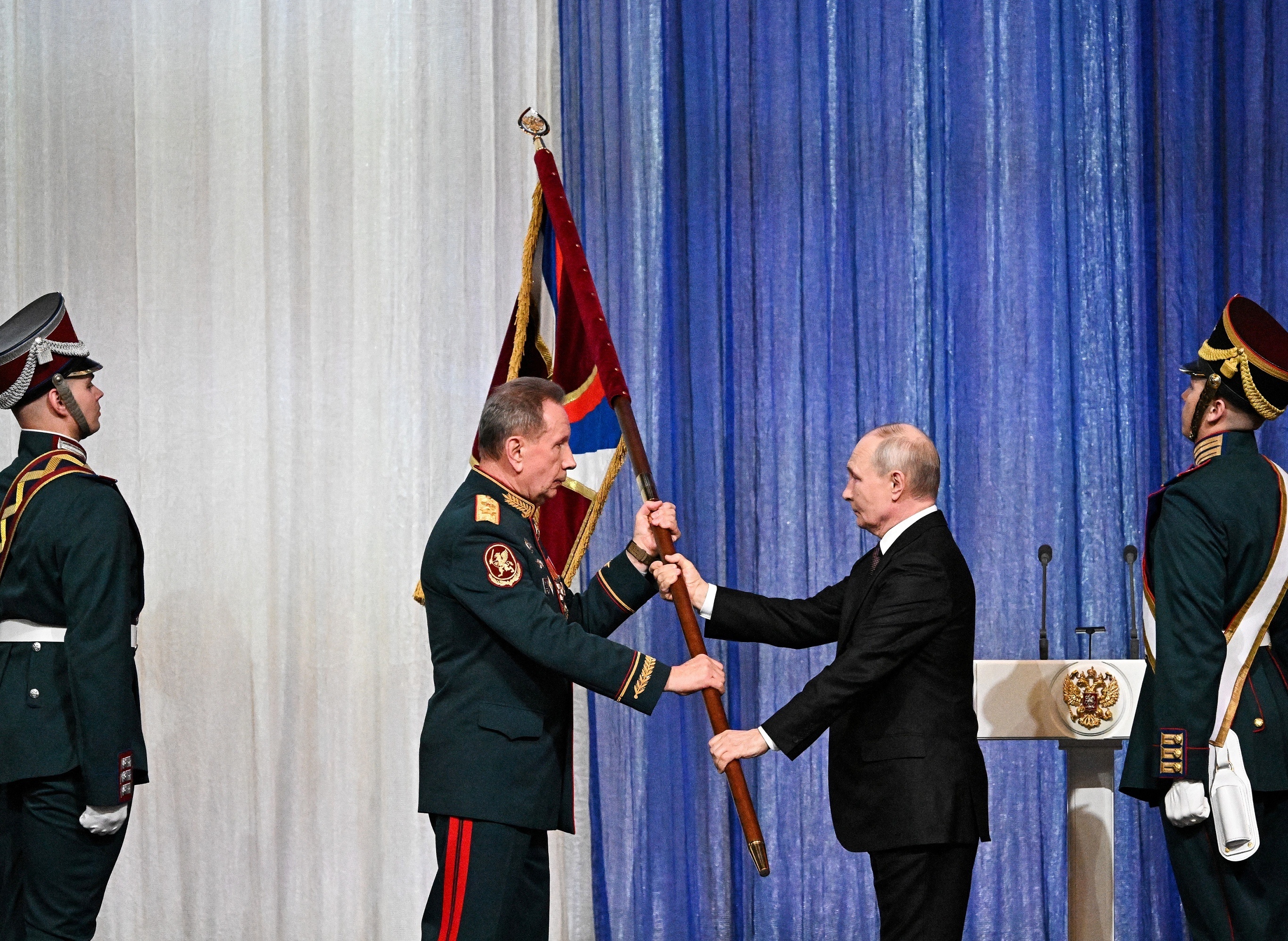 俄罗斯总统 Vladimir Putin 向俄联邦国民近卫军总司令授予旗帜荣誉,莫斯科。3月27日,克里姆林宫举办俄联邦国民近卫军成立10周年庆祝仪式,俄总统 Putin 在致辞中称赞国民近卫军为打击恐怖主义、极端主义和各种形式的犯罪作出重大贡献,是国家安全体系中可靠且不可或缺的组成部分,指示该机构加强与武装部队及各级部门的合作,迅速有效应对新出现的威胁,竭尽全力减少犯罪、破坏和敌对行动对国家的损害。俄国民近卫军成立于2016年,由俄总统 Putin 直接指挥,主要职责为反恐、防暴、维护内部治安,现有人员规模约40万人。摄影师:Sergei Bobylyov