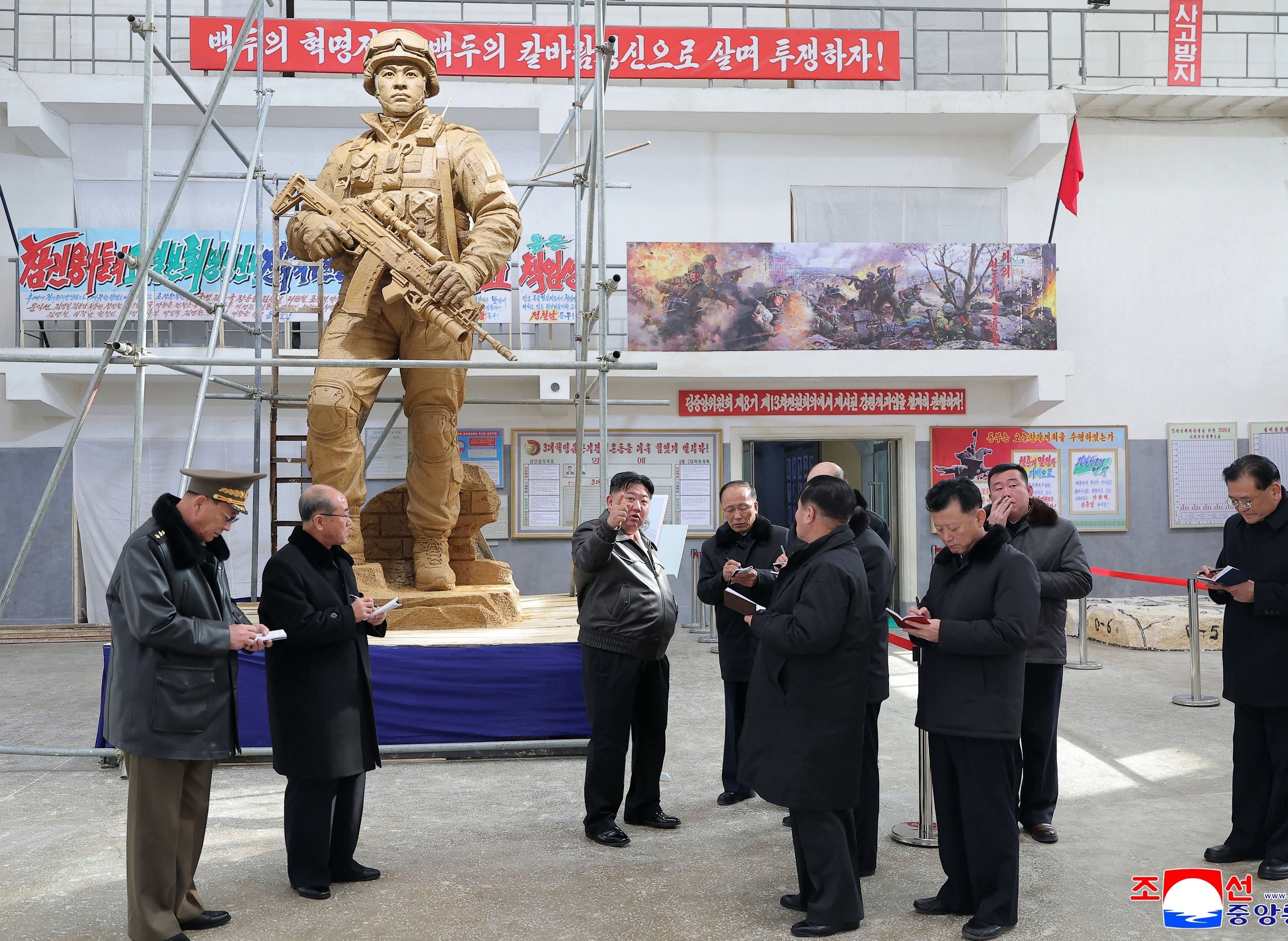 朝鲜最高领导人金正恩指导海外作战士兵雕像创作工作,平壤。1月25日,金正恩访问平壤万寿台创作社,亲自指导海外军事作战功勋纪念馆的雕像创作过程。金正恩在讲话中强调,朝鲜军队向时代证明了「精神力量的强者百战必胜」这一实力法则和不变哲理,指示创作人员以高标准完成雕像创作,要求作品具有真实感、细腻性、造型美,反映朝鲜军队的战斗气概、崇高的战友情和热爱祖国的精神,确保雕塑形式和建筑物之间的和谐统一。摄影师:KCNA