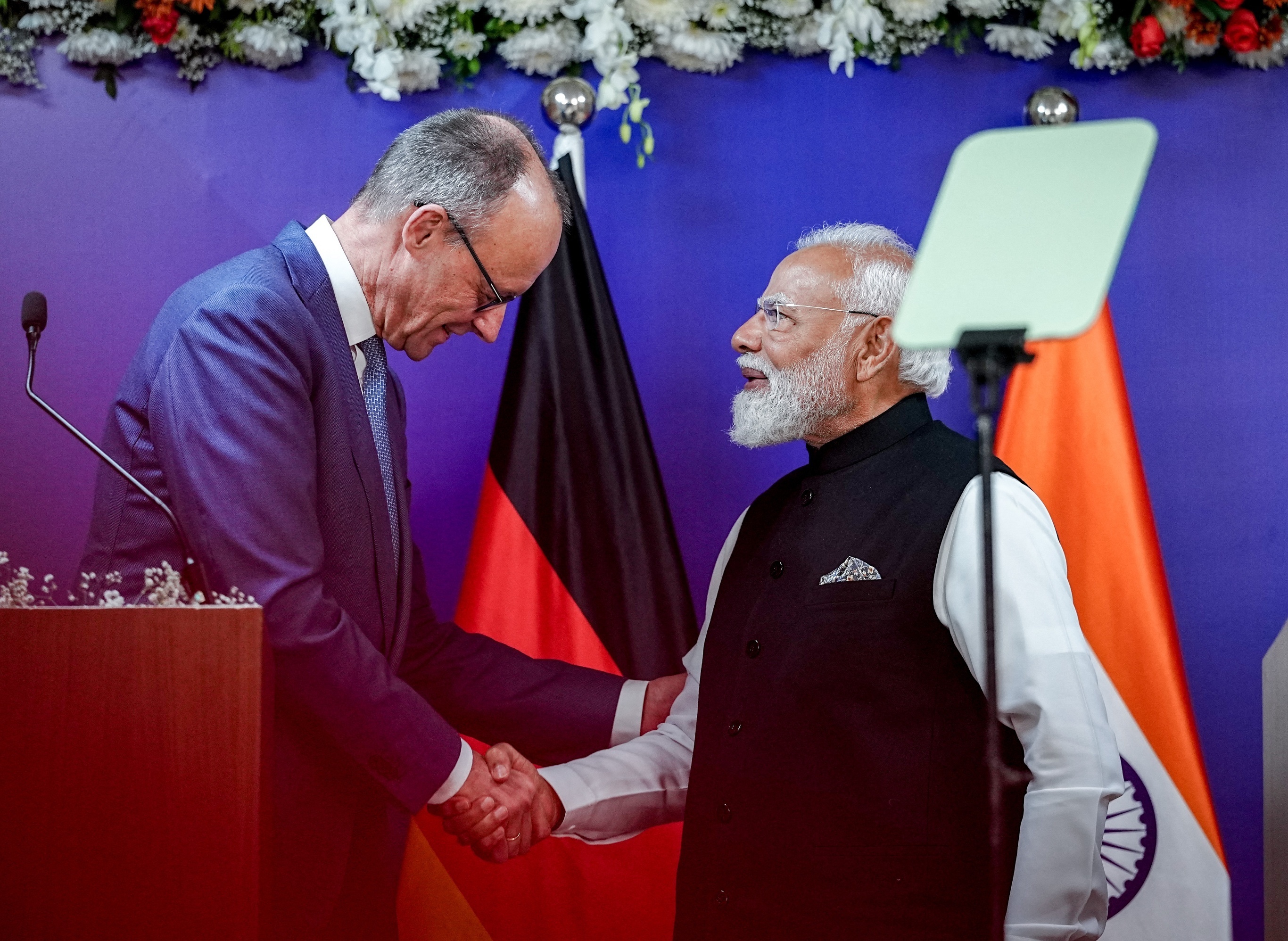 印度总理 Narendra Modi 与德国总理 Friedrich Merz 举行联合新闻发布会,艾哈迈达巴德。1月12日,德国总理 Merz 上任以来首次对印度进行国事访问。两国领导人就双边关系、经贸合作、国际及地区局势等议题交换意见,见证签署经济投资、国防安全、人工智能、稀土开采等领域27项合作意向声明与协议,其中包括一份价值80亿美元的潜艇制造协议。根据该协议,德国蒂森克虏伯公司将与印度马扎冈造船厂联合建造6艘214型柴电潜艇,并向后者提供全面技术转让。2025年德印双边贸易额超过500亿美元,占印度与欧盟贸易额约25%。摄影师:Kay Nietfeld