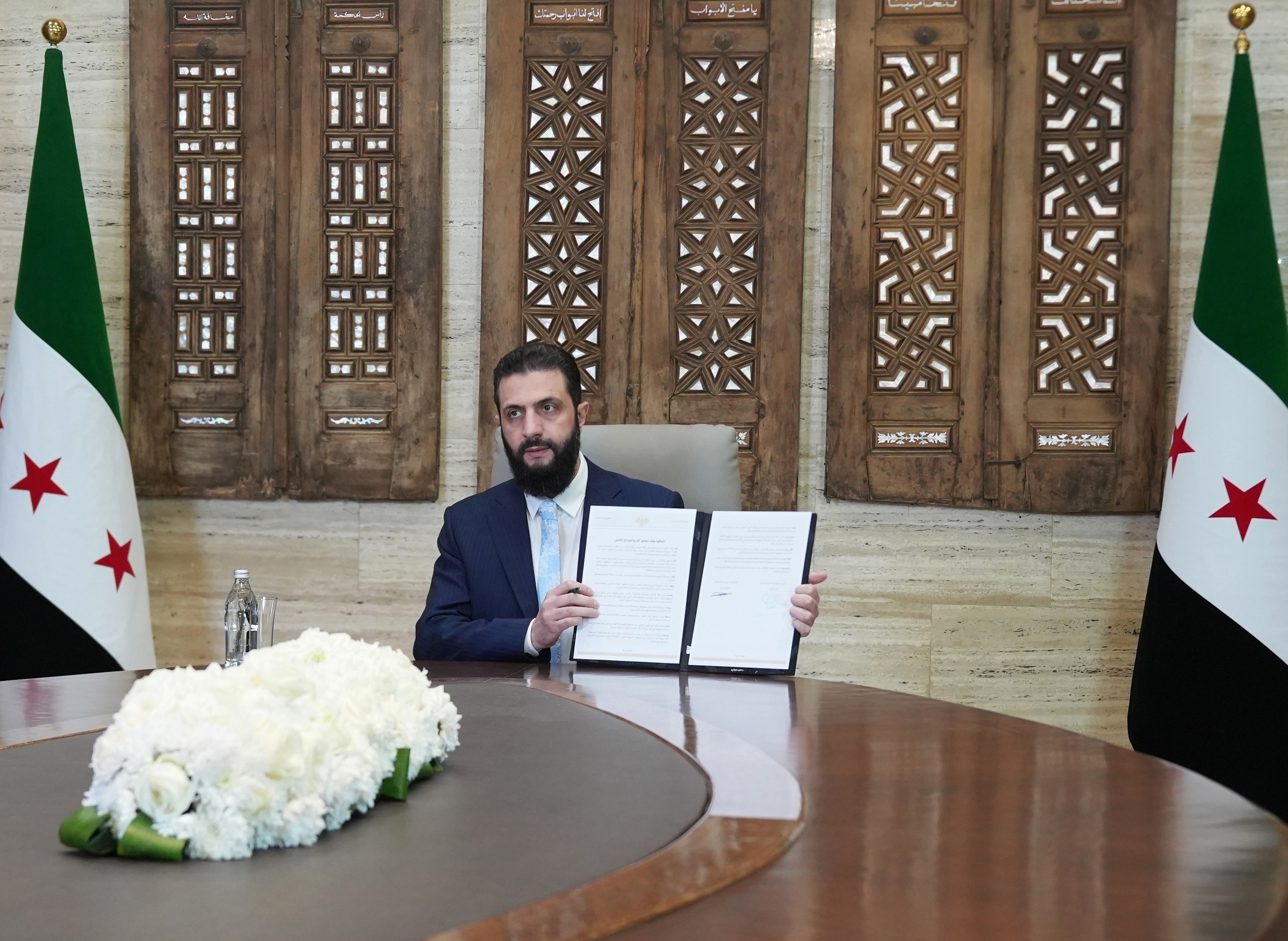 叙利亚过渡政府总统 Ahmed al-Sharaa 签署与库尔德武装的停火协议,大马士革。1月18日,叙利亚过渡政府宣布与库尔德武装「叙利亚民主力量」(SDF)达成停火和全面整合协议,双方同意立即在所有战线及接触点实施全面停火,并将该武装组织人员整合进入国防与政府体系。叙利亚总统 al-Sharaa 宣布已签署法令将库尔德语纳入官方语言,并将库尔德新年定为国家法定节日。摄影师:iDaily Media