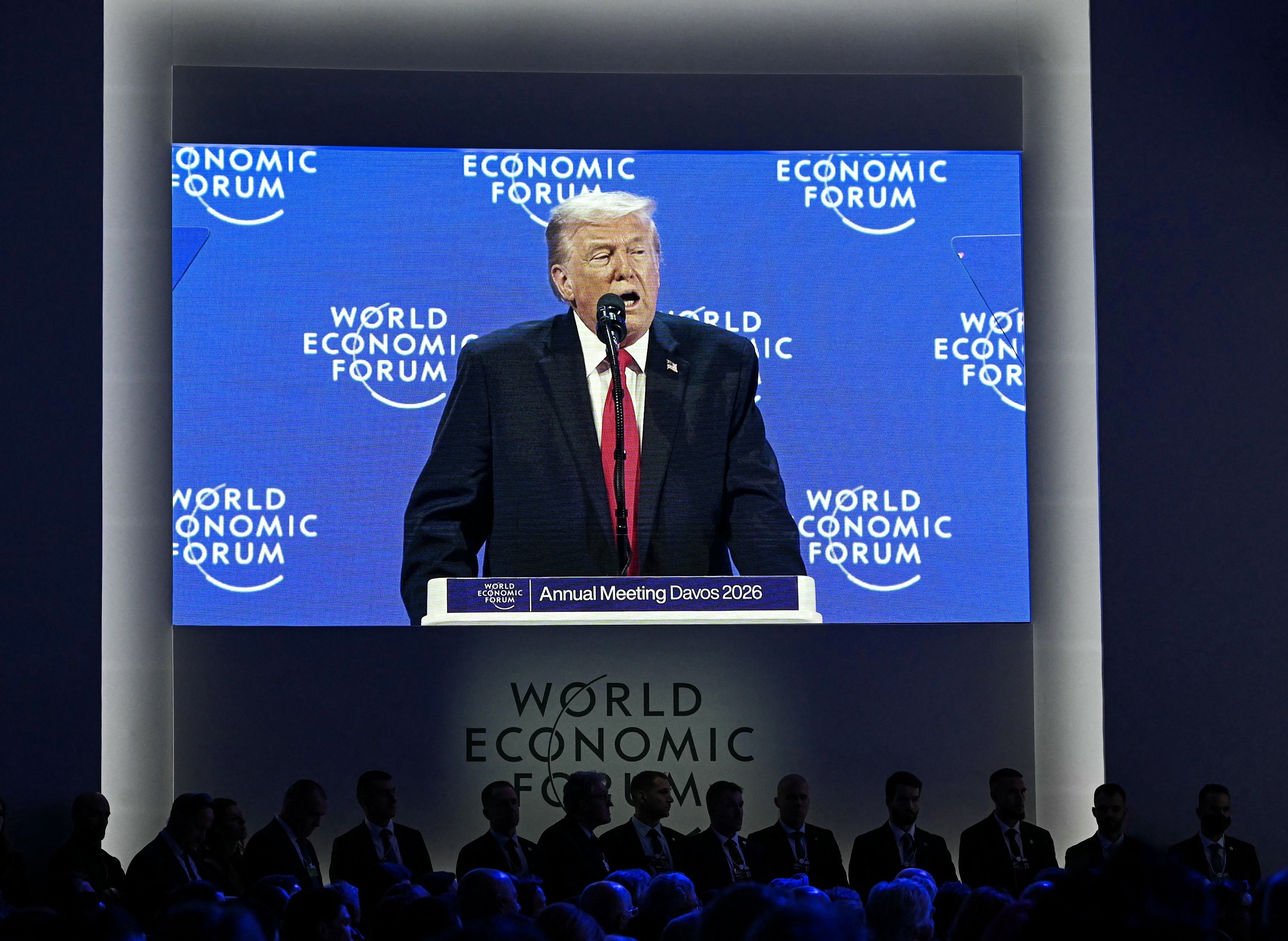 美国总统 Donald Trump 在达沃斯论坛上发表演讲,瑞士。1月21日,美国总统 Trump 时隔6年再次现场出席达沃斯论坛,他在长达1小时的演讲中夸赞自己执政一年取得「前所未有」的经济奇迹,获得创纪录的18万亿美元投资承诺、达成覆盖40%贸易额的历史性贸易协议。Trump 指控欧洲缺少对美国的感恩之心,宣称如果不是美国赢得二战,欧洲人可能都在说德语以及一点日语,并强调美国要求的仅仅是一块叫做格陵兰岛的「寒冷且位置偏远的冰块」。当天 Trump 宣布与北约秘书长达成一项关于格陵兰岛的合作框架,将暂停原定于2月1日实施的对欧洲8国惩罚性关税。摄影师:Fabrice Coffrini