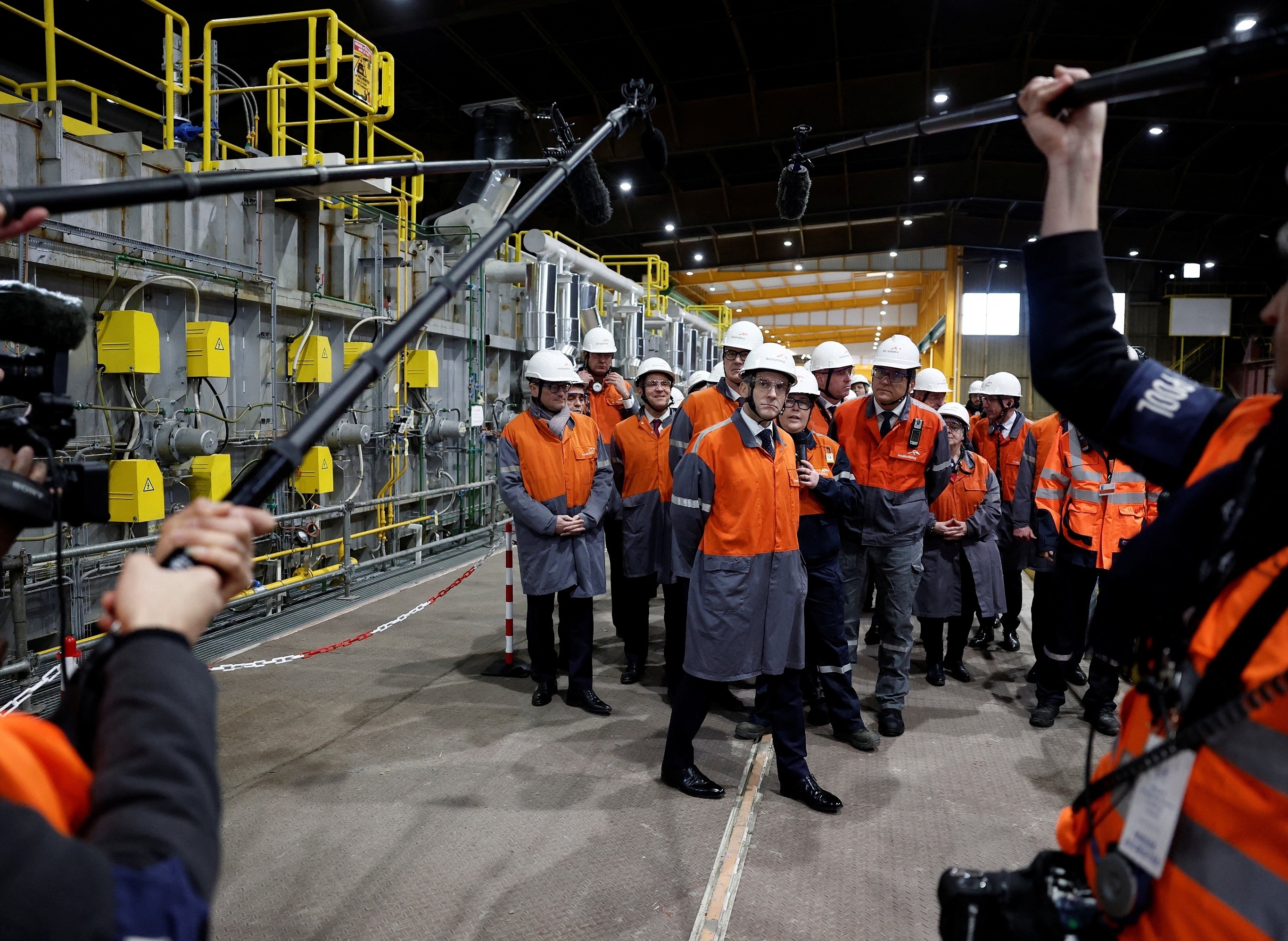 法国总统 Emmanuel Macron 视察全球第二大钢铁生产商安赛乐米塔尔集团旗下钢铁厂,敦刻尔克。2月10日,安赛乐米塔尔集团宣布将投资13亿欧元在敦刻尔克钢铁厂建设一座新型低碳电弧炼钢炉,预计于2029年投产,年产能达到200万吨。这座新型电弧炉的二氧化碳排放量将比现有燃煤炉降低三分之二,法国政府将通过节能政策为其提供一半资金补贴。法国总统 Macron 当天在讲话中强调,欧洲必须拥有钢铁生产能力才能制造本土汽车和基础设施。摄影师:Benoit Tessier