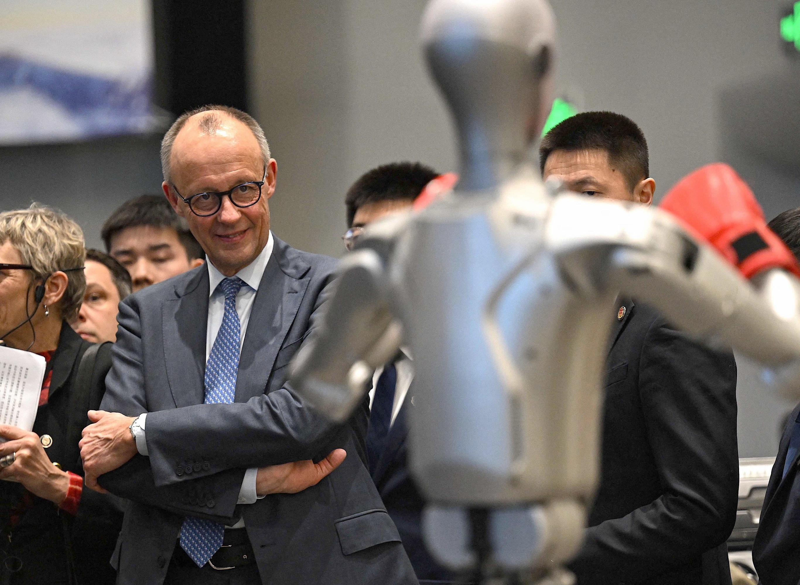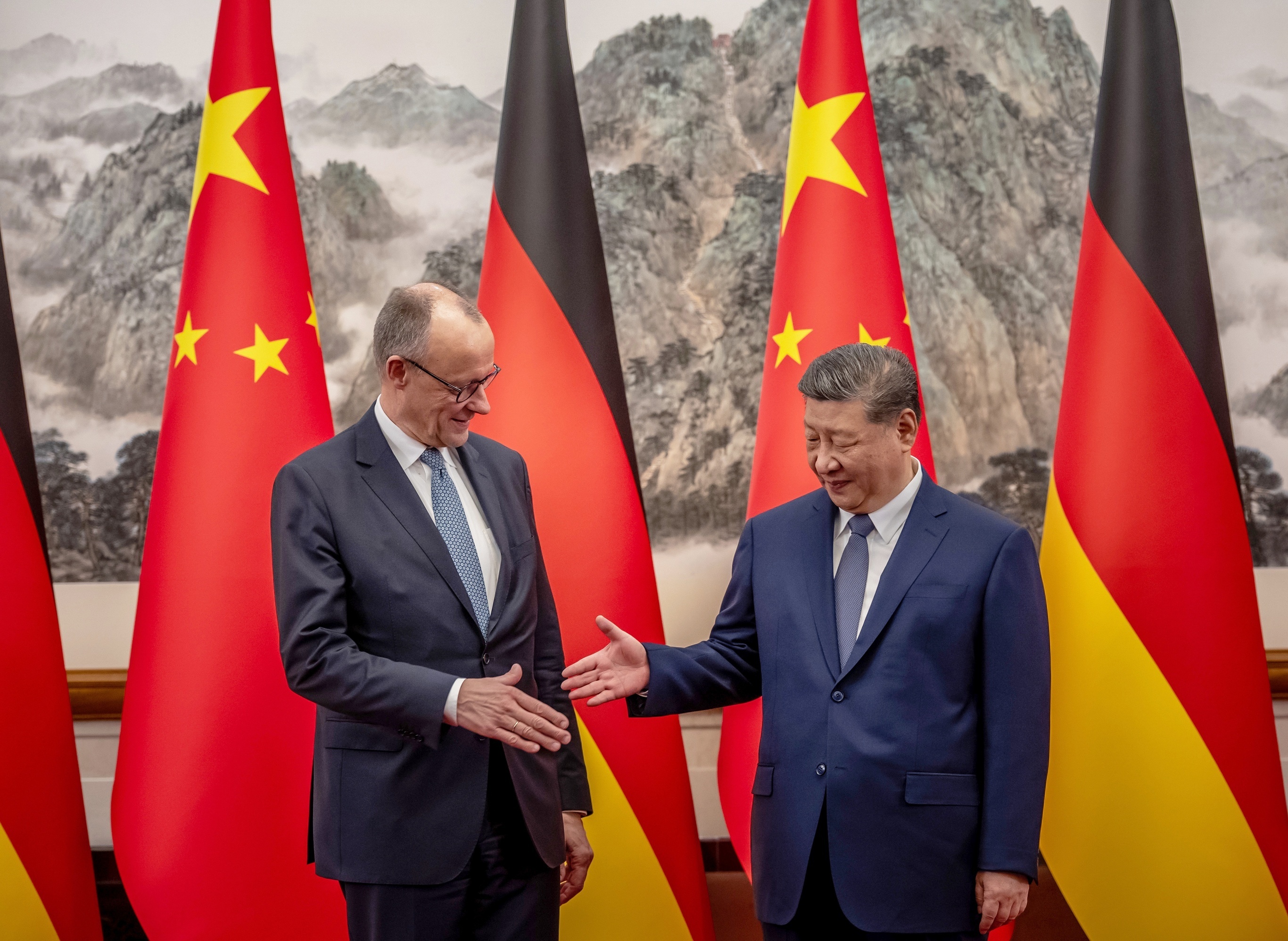 中国国家主席习近平与德国总理 Friedrich Merz 举行会晤,北京。2月25日,德国总理 Merz 应邀对中国进行上任后首次访问,两国领导人就中德关系、国际地区问题及经济政策等议题交换意见,见证签署绿色转型、海关、体育、媒体等领域合作文件。双方会后发表联合声明,强调经贸合作是中德双边关系的重要组成部分,双方愿通过坦诚开放对话妥善解决彼此关切,以确保长期、平衡、可信赖、可持续的经贸关系。中国是德国最大贸易伙伴,2025年中德双边贸易额达1.51万亿元人民币,同比增长5.2%。摄影师:Michael Kappeler