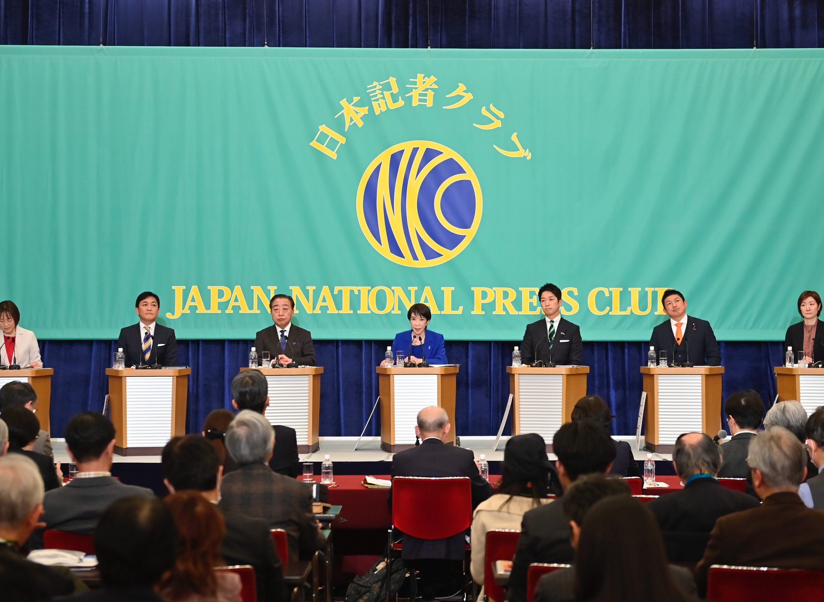 日本共产党、国民民主党、中道改革联合党、自民党、维新会、参政党和令和新选组7党党首参加辩论会,东京。1月26日,日本朝野7个政党党首围绕物价上涨对策、外交、安保等议题进行辩论。自民党总裁兼现任首相高市早苗的竞选主张为「负责任的积极财政」,主张以投资和减税拉动经济增长;最大在野党中道改革联合党党首野田佳彦的竞选主张为「生活者优先」,主张避免日元过度贬值,并推行务实的外交与防卫政策。日本第51届众议院选举将于2月8日进行投票,最新民调显示自民党以40%支持率位居第一,中道改革联合党以13%支持率排名第二,国民民主党以9%支持率排名第三。摄影师:David Mareuil