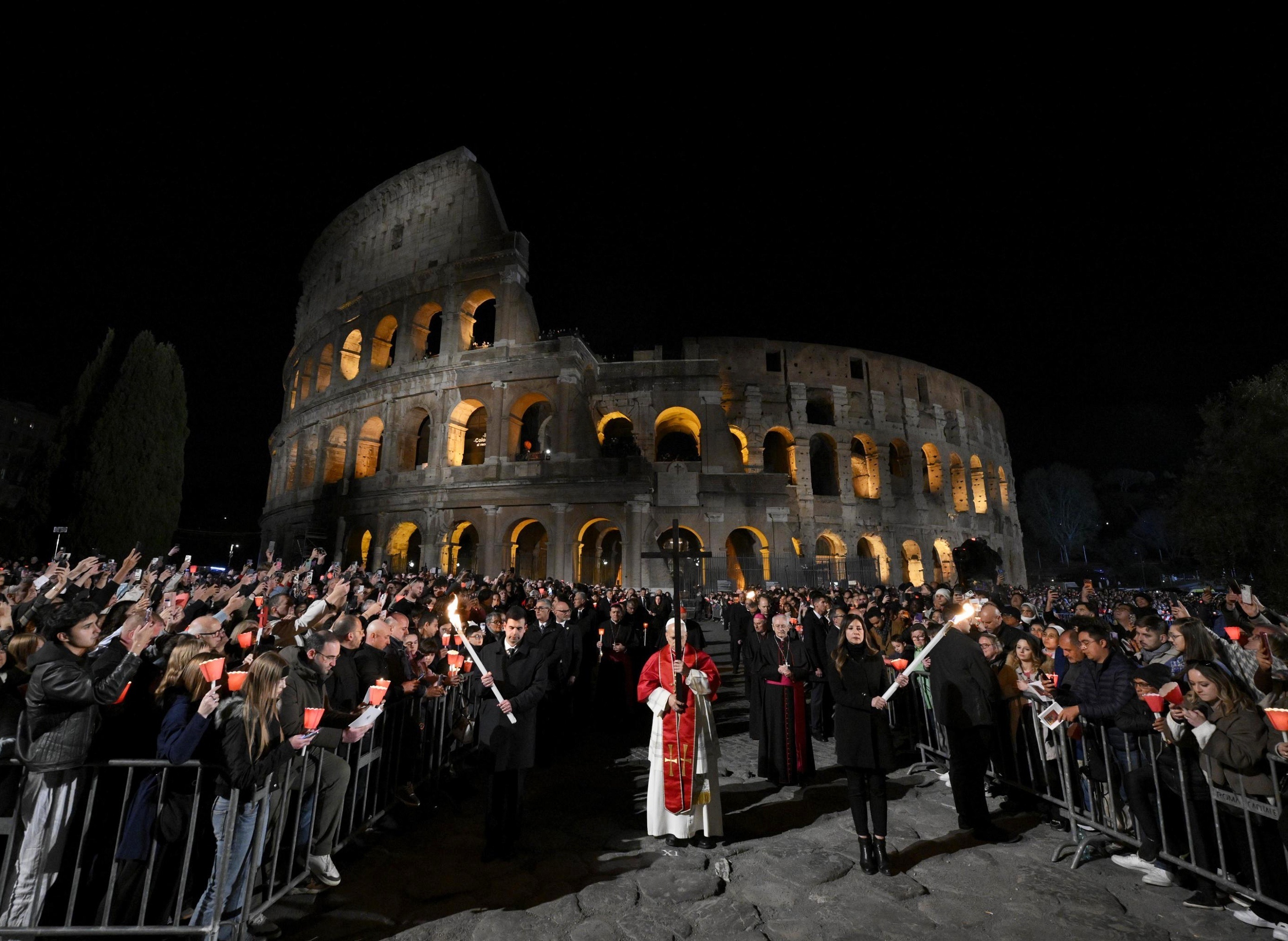 罗马教宗良十四世在罗马斗兽场主持任内首个圣周五「拜苦路」(Via Crucis)游行祷告仪式,意大利。4月3日,现年70岁的教宗良十四世手持木制十字架,步行约2个小时完成长达14站的「拜苦路」游行,成为32年来首次完成此举的罗马教宗。教宗良十四世在仪式中诵读的祷文提到,每个当权者都要为其滥用权力开启战争、施行暴力、压榨他人的罪行面临上帝的审判。摄影师:Vatican Media