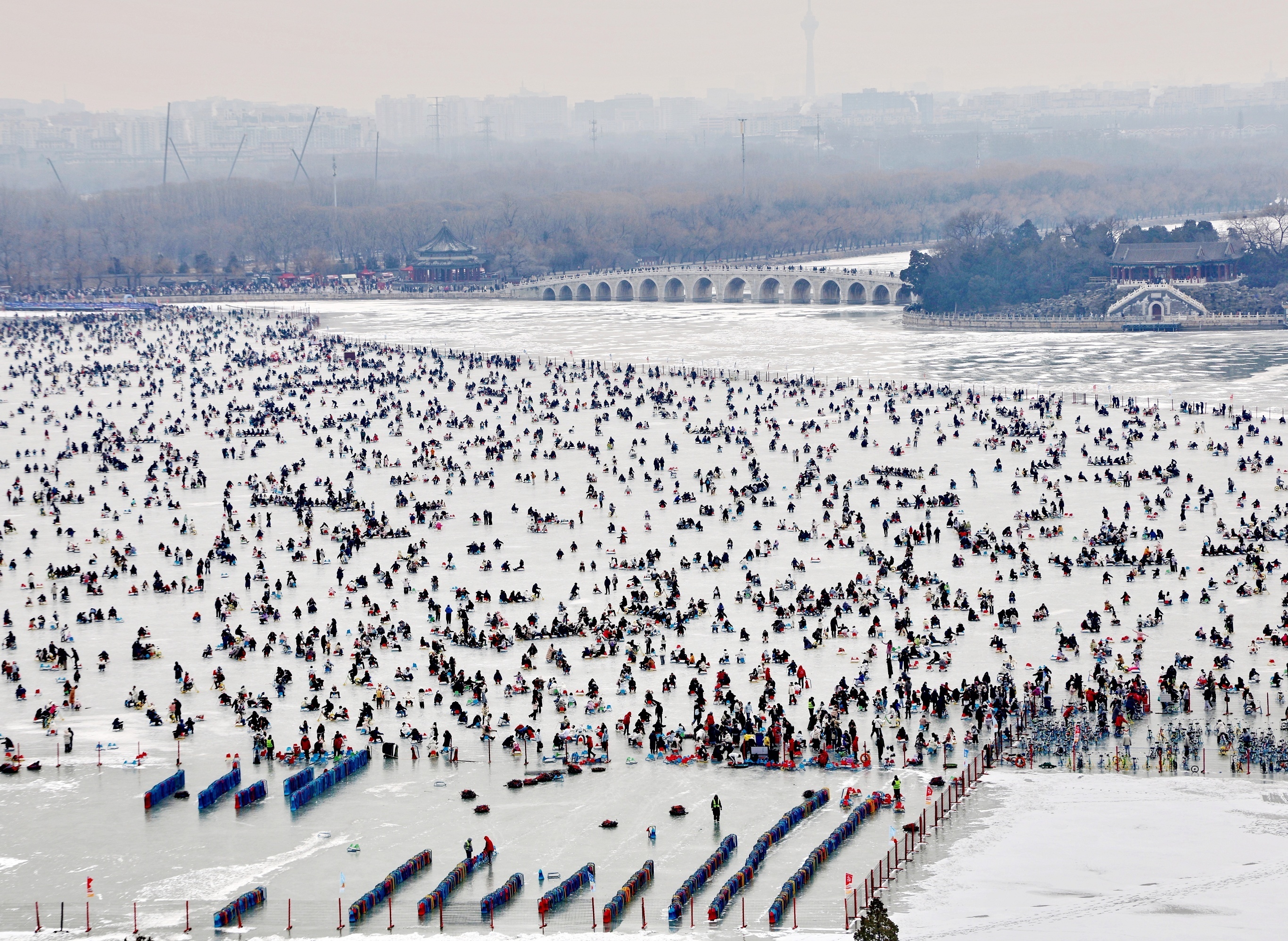 北京市民们在颐和园昆明湖冰场上游玩。1月17日,北京最大的天然户外滑冰场昆明湖冰场正式向公众开放,首日接待游客数量达1.4万人次。昆明湖位于北京颐和园内,面积达200公顷,湖中建有仿杭州西湖的「西堤六桥」,周围标志性景点包括万寿山、佛香阁、清晏舫、排云殿、知春亭等。受北京入冬气温较暖影响,本季昆明湖冰场整体运营面积从往年的35万平方米缩小至16万平方米,开放时间持续至2月4日。摄影师:iDaily Media