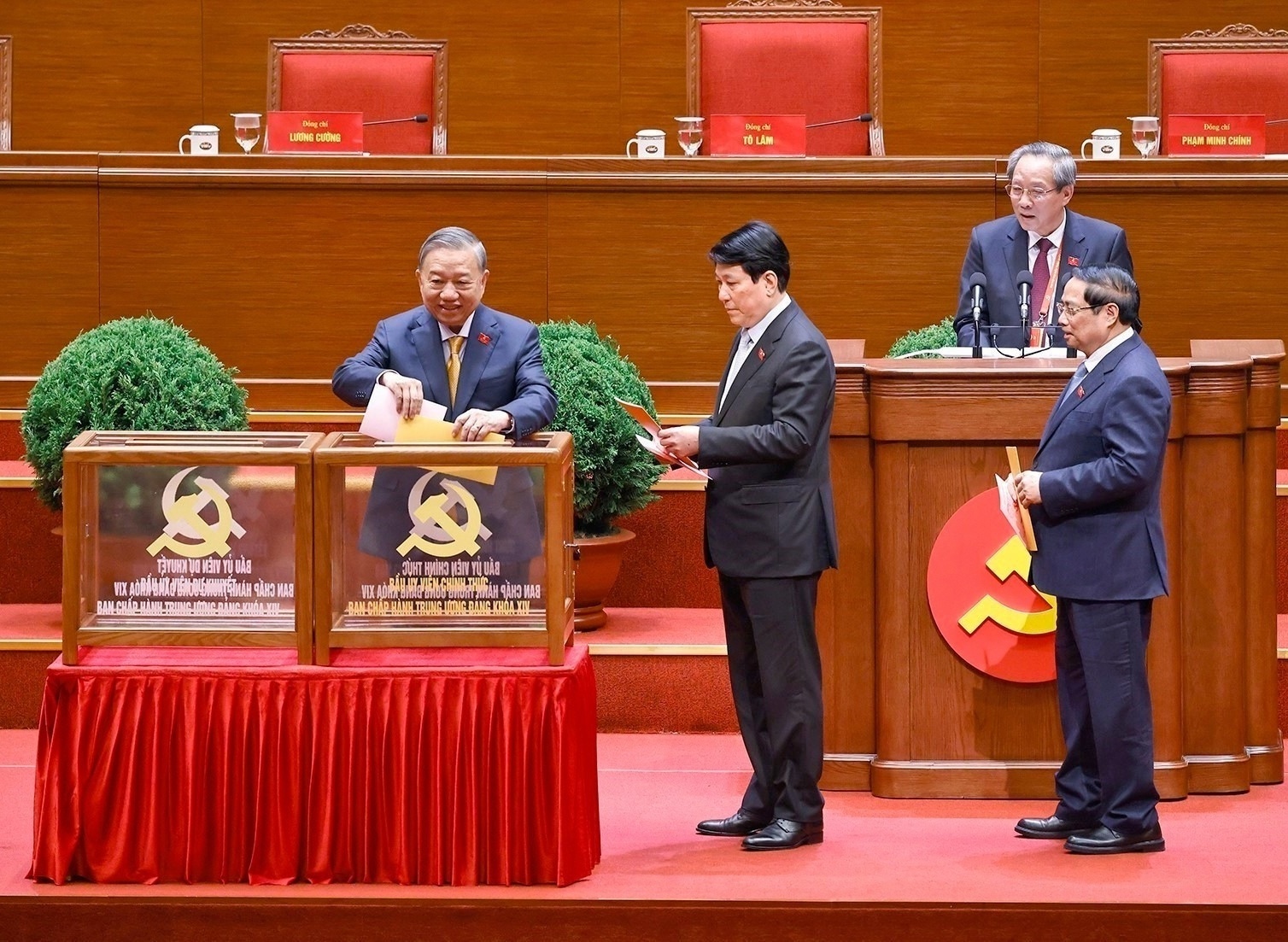 越南共产党中央总书记苏林、国家主席梁强、政府总理范明政参加第十四届中央委员会选举投票,河内。1月23日,越共第十四届中央委员会举行第一次全体会议,苏林再次当选越共中央总书记,任期持续至2030年。根据大会公布的第十四届中央委员会名单,越共中央总书记苏林、国会主席陈青敏、中央书记处常务书记陈锦绣等3位党和国家主要领导人留任中央委员,而现任国家主席梁强和政府总理范明政未能当选中央委员。本届大会因议程调整于1月23日提前闭幕,比原计划缩短一天半。摄影师:VNA